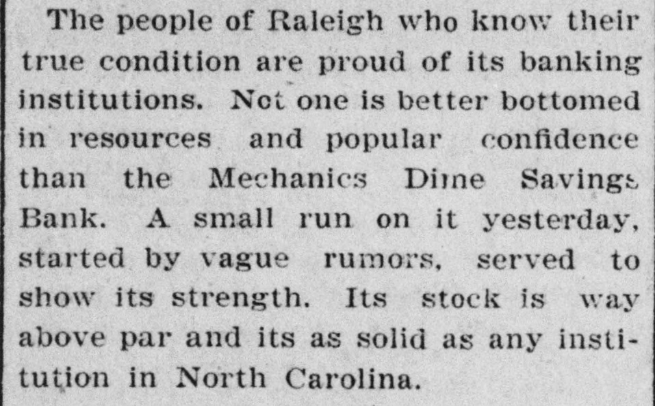 The people of Raleigh who know their true condition are proud of its banking institutions. Not one is better bottomed in resources and popular confidence than the Mechanics Dime Savings Bank. A small run on it yesterday, started by vague rumors, served to show its strength. Its stock is way above par and its as solid as any institution in North Carolina.