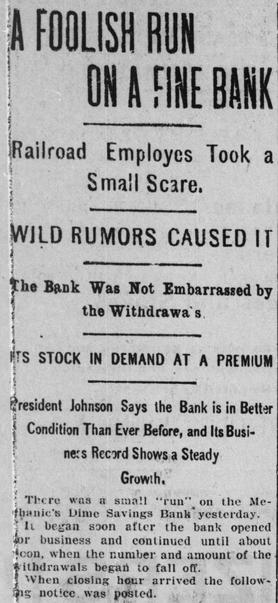 There was a small "run" on the Mechanic's Dime Savings Bank yesterday. It began soon after the bank opened for business and continued until about noon, when the number and amount of the withdrawals began to fall off.