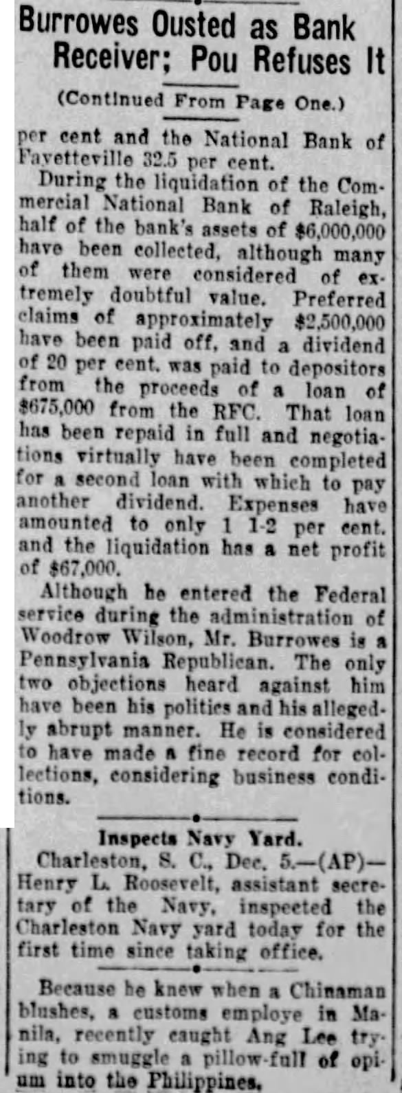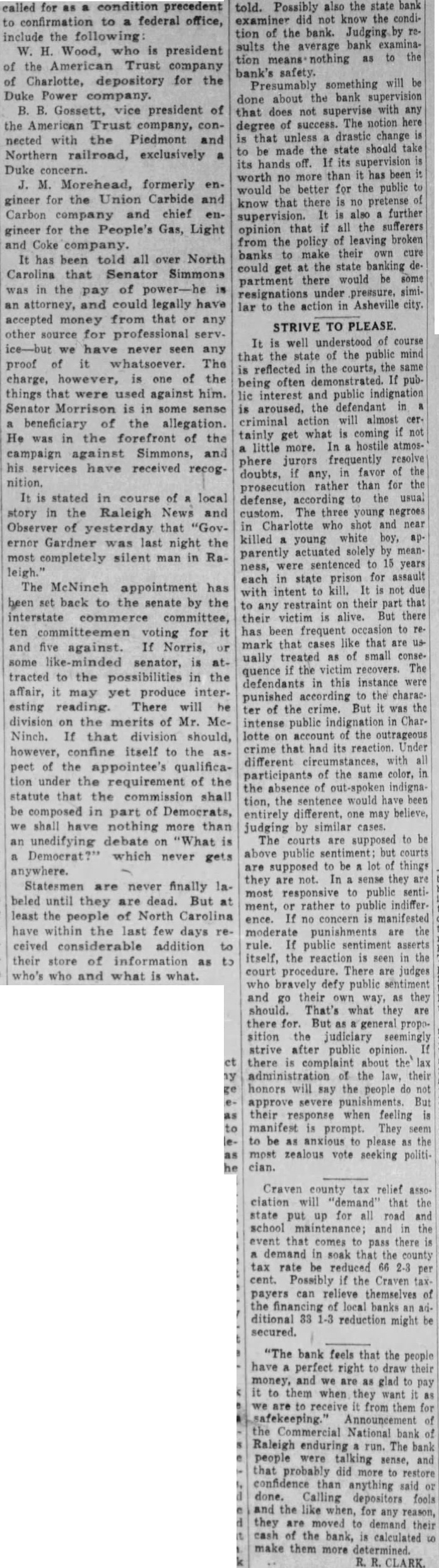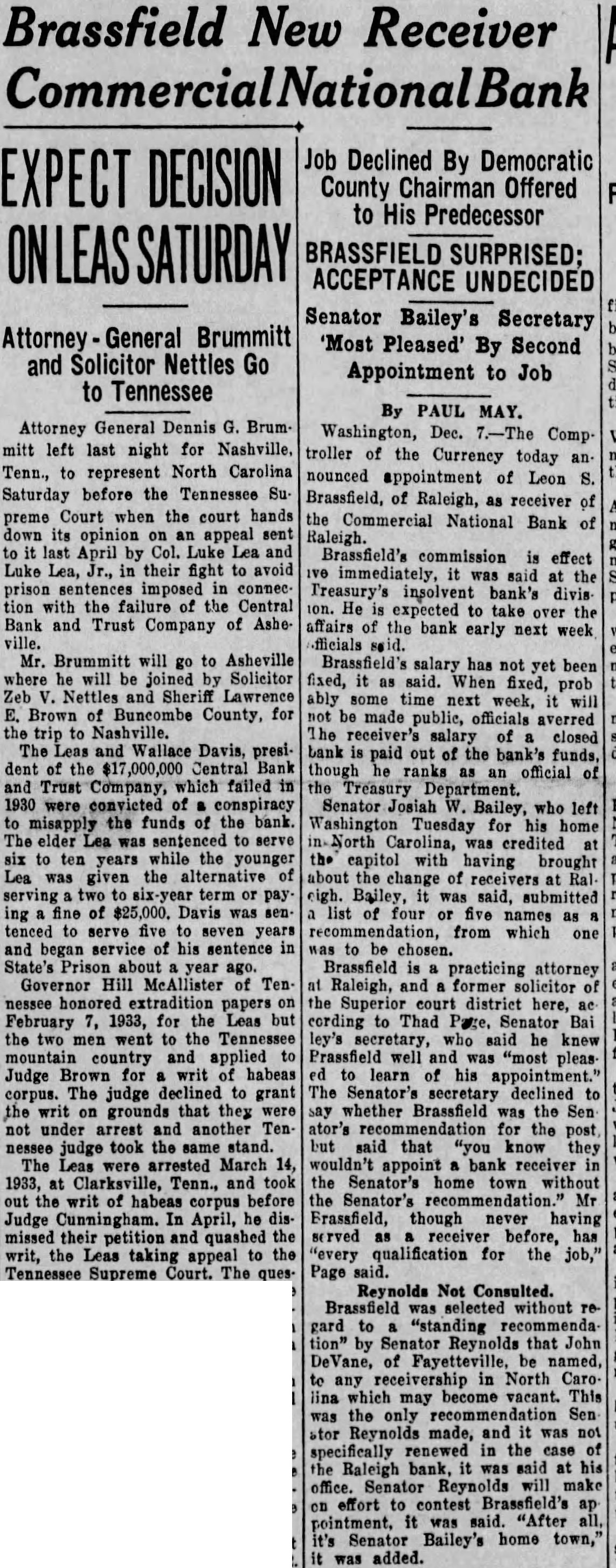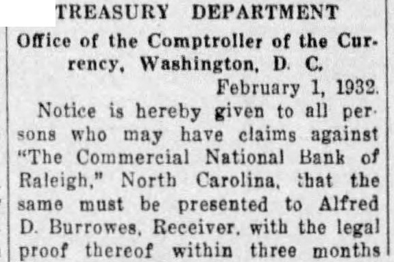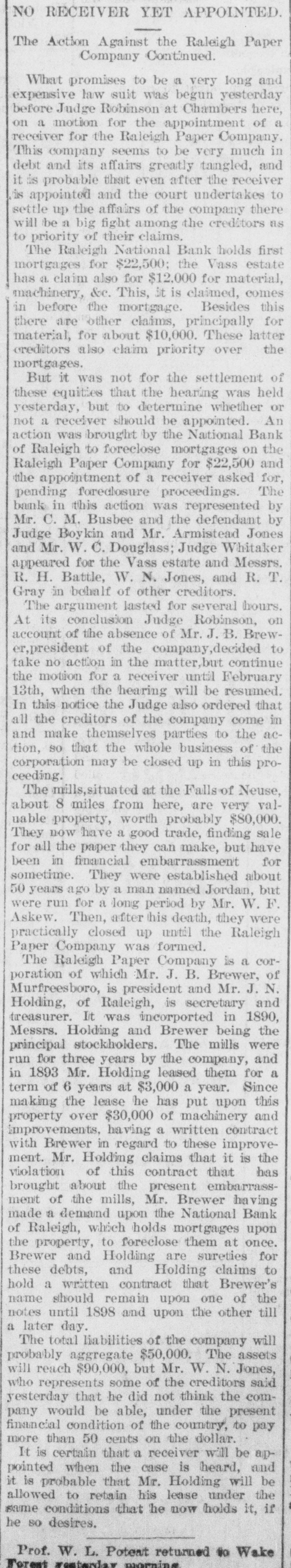 NO RECEIVER YET APPOINTED. The Action Against the Raleigh Paper Company Continued What promises to be a very long and expensive law suit was begun yesterday before Judge Robinson at Chambers here, a on a motion for the appointment of receiver for the Raleigh Paper Company. This company seems to be very much in debt and its affairs greatly tangled, and it is probable that even after the receiver is appointed and the court undertakes to settle up the affairs of the company there will be a big fight among the creditors as to priority of their claims. The Raleigh National Bank holds first mortgages for $22,500; the Vass estate has a claim also for $12.000 for material, machinery, &c. This, it is claimed, comes in before the mortgage. Besides this there are other claims, principally for material, for about $10,000. These latter the creditors also claim priority over mortgages. But it was not for the settlement of these equities that the hearing was held yesterday, but to determine whether An or not a receiver should be appointed action was brought by the National Bank of Raleigh to foreclose mortgages on the Raleigh Paper Company for $22,500 and the appointment of a receiver asked for, pending foredlosure proceedings. The bank in this action was represented by Busbee and the and Mr. Judge Mr. C. Boykin M. Armistead defendant Jones by W.C. Douglass; for the Vass W. N. Jones, and appeared R. H. Mr. Battle, estate Judge and and Whitaker Messrs. R. T. Gray in behalf of other creditors. The argument lasted for several hours. At its conclusion Judge Robinson, on account of the absence of Mr. J. B. Brewof the to take in the matter,but er,president no action company,decided continue the motion for a receiver until February 13th, when the hearing will be resumed. In this notice the Judge also ordered that all the creditors of the company come in and make themselves parties to the action, so that the whole business of the corporation may be closed up in this proceeding. The mills,situated at the Falls of Neuse, miles from here, are very worth about uable property, 8 probably $80,000. valThey now have a good trade, finding sale for all the paper they can make, but have for been in financial embarrassment were sometime. They established Jordan, about but 50 years ago by a man named were run for a long period by Mr. W. F. Askew. Then, after this death, they were closed up until practically formed. the Raleigh Paper Company was The Raleigh Paper Company is a corporation of which Mr. J. B. Brewer, of is president N. of is Murfreesboro, Holding, Raleigh, secretary and Mr. J. and It was incorported in 1890, and Brewer treasurer. Messrs. Holding The mills being were the principal stockholders. three years by company, run 1893 for Holding the them for and in Mr. leased a term of 6 years at $3,000 a year. Since making the lease he has put upon this over $30,000 of and having a improvements, property written machinery contract with Brewer in regard to these improvement. Mr. Holding claims that it is the has violation of this contract that about the present the Mr. ment brought of mills, Brewer embarrass- having made a demand upon the National Bank of Raleigh, which holds mortgages upon the to foreclose them at once. are Brewer property, and Holding sureties claims for these debts, and Holding to hold a written contract that Brewer's name should remain upon one of the notes until 1898 and upon the other till a later day. The total liabilities of the company will probably aggregate $50,000. The assets but Mr. W. N. Jones, who some of the will reach represents $90,000, think creditors the said that he did not comwould be able, under yesterday pany the present financial condition of the country, to pay more than 50 cents on the dollar. It is certain that a receiver will be apwhen the case is pointed is probable heard, will and it that Mr. Holding be allowed to retain his lease under the same conditions that he now holds it, if he so desires. Prof. W. L. Poteat returned to Wake Torent westerday morning