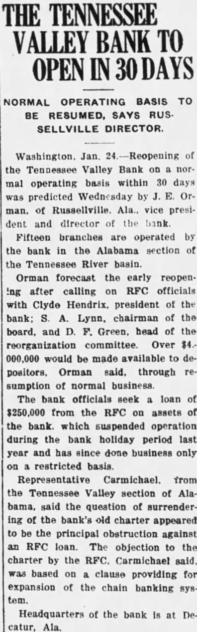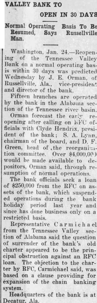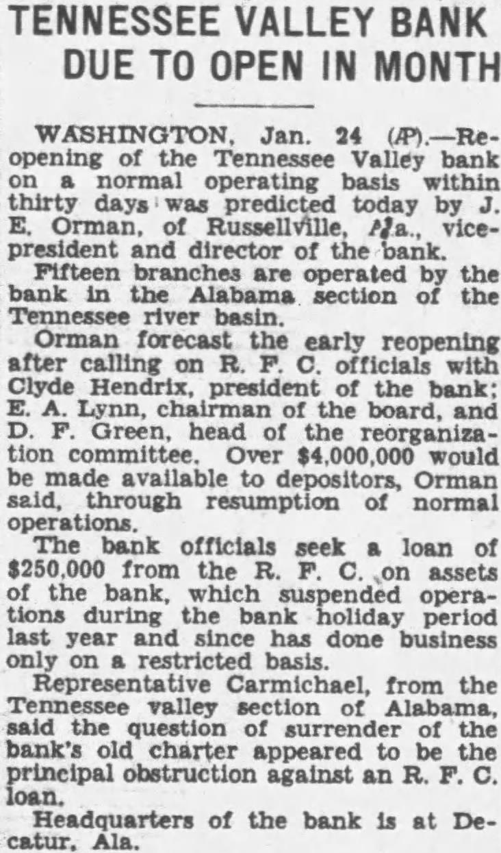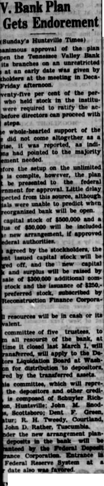 Bank Gets Endorement (Sunday's Huntsville Times) approval of the plan the Tennessee Valley Bank its branches on an unrestricted an early date was given by at the meeting in DecaFriday afternoon. per cent of the perwho held stock in the institurequired to ratify the directors can proceed with steps. support of the did not come altogether was reported, as indihad pointed to the majority needed. the setup on the unlimited complte, however, the plan be presented to the federal rnment for approval. Little delay pected from this source, although were unable to predict when reorganized bank will be open. capital stock of $500,000 and of $50,000 will be included new arrangement, if approved authorities. agreed by the stockholders, the issued capital stock will off. and the new capital surplus will be raised by of $300,000 additional stock and the issuance of $250,preferred stock. subscribed Finance Corpora- resources will be in cash or its of five to committee all of the bank, at it closed last March will will apply to the DeLiquidation Board at for distribution to depositors, by the transferred assets. committee, which will reprethe depositors and other credicomposed of Schuyler John M. Dent Green, R. H. Courtland, John Rather, Tuscumbia. the new plandeposits the Federal Deposit Entrance Federal Reserve System at date also was favored