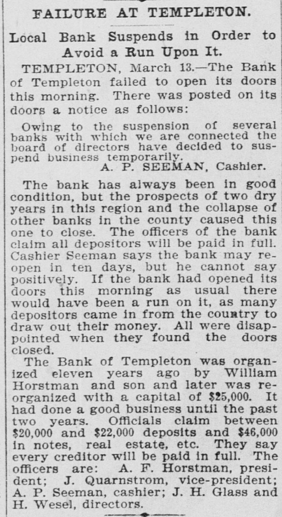 FAILURE AT TEMPLETON. Local Bank Suspends in Order to Avoid a Run Upon It. TEMPLETON, March 13.-The Bank of Templeton failed to open its doors this morning. There was posted on its doors a notice as follows: Owing to the suspension of several banks with which we are connected the board of directors have decided to suspend business temporarily. A. P. SEEMAN, Cashier. The bank has always been in good condition, but the prospects of two dry years in this region and the collapse of other banks in the county caused this one to close. The officers of the bank claim all depositors will be paid in full. Cashier Seeman says the bank may reopen in ten days, but he cannot say positively. If the bank had opened its doors this morning as usual there would have been a run on it, as many depositors came in from the country to draw out their money. All were disappointed when they found the doors closed. The Bank of Templeton was organized eleven years ago by William Horstman and son and later was reorganized with a capital of $25,000. It had done a good business until the past two years. Officials claim between $20,000 and $22,000 deposits and $46,000 in notes, real estate, etc. They say every creditor will be paid in full. The officers are: A. F. Horstman, president; J. Quarnstrom, vice-president; A. P. Seeman, cashier; J. H. Glass and H. Wesel, directors.