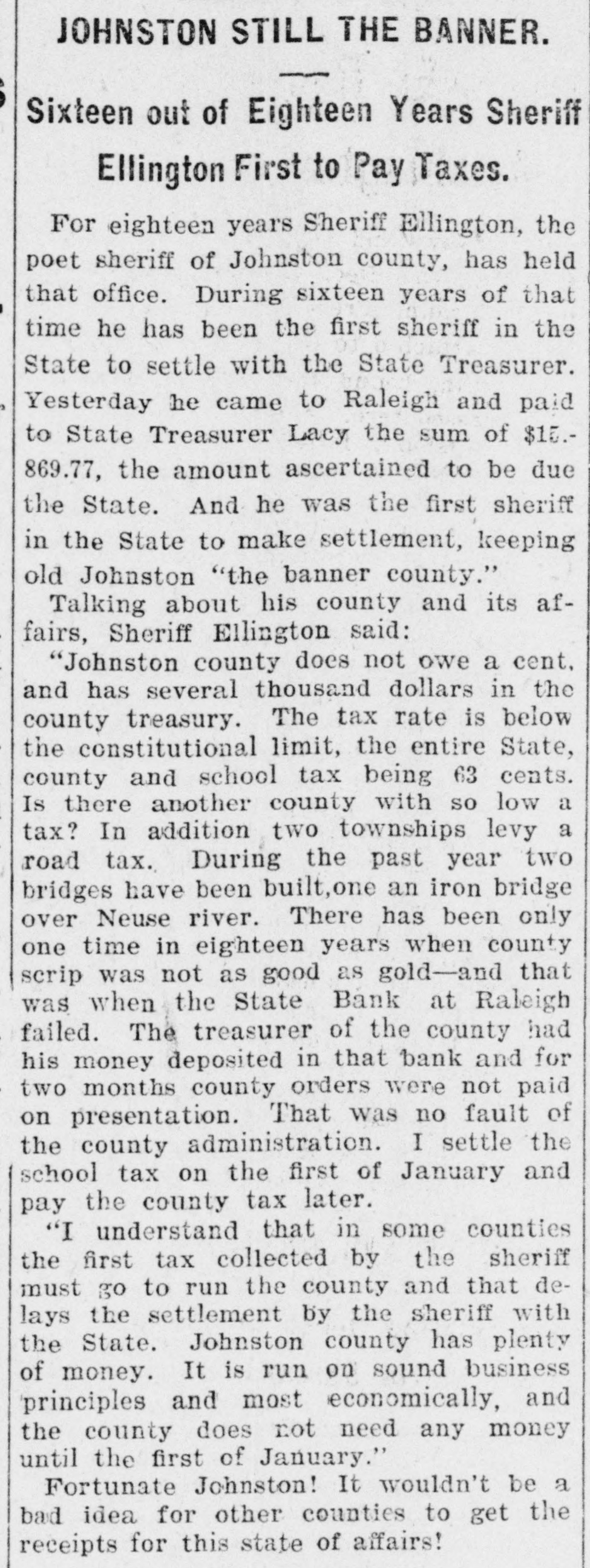 # JOHNSTON STILL THE BANNER. Sixteen out of Eighteen Years Sheriff Ellington First to Pay Taxes. For eighteen years Sheriff Ellington, the poet sheriff of Johnston county, has held that office. During sixteen years of that time he has been the first sheriff in the State to settle with the State Treasurer. Yesterday he came to Raleigh and paid to State Treasurer Lacy the sum of $15,869.77, the amount ascertained to be due the State. And he was the first sheriff in the State to make settlement, keeping old Johnston "the banner county." Talking about his county and its affairs, Sheriff Ellington said: "Johnston county does not owe a cent, and has several thousand dollars in the county treasury. The tax rate is below the constitutional limit, the entire State, county and school tax being 63 cents. Is there another county with so low a tax? In addition two townships levy a road tax. During the past year two bridges have been built, one an iron bridge over Neuse river. There has been only one time in eighteen years when county scrip was not as good as gold—and that was when the State Bank at Raleigh failed. The treasurer of the county had his money deposited in that bank and for two months county orders were not paid on presentation. That was no fault of the county administration. I settle the school tax on the first of January and pay the county tax later. "I understand that in some counties the first tax collected by the sheriff must go to run the county and that delays the settlement by the sheriff with the State. Johnston county has plenty of money. It is run on sound business principles and most economically, and the county does not need any money until the first of January." Fortunate Johnston! It wouldn't be a bad idea for other counties to get the receipts for this state of affairs!
