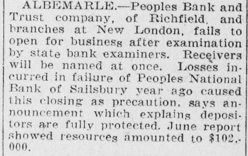 ALBEMARLE.-Peoples Bank and Trust company, of Richfield, and branches at New London, fails to open for business after examination by state bank examiners. Receivers will be named at once. Losses incurred in failure of Peoples National Bank of Sailsbury year ago caused this closing as precaution, says announcement which explains depositors are fully protected. June report showed resources amounted to $102,000.