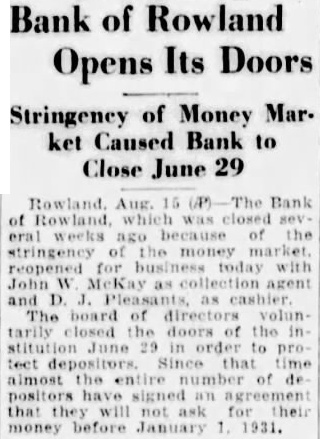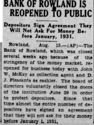 BANK OF ROWLAND IS REOPENED TO PUBLIC Depositors Sign Agreement They Will Not Ask For Money Before January, 1931. Bank of Rowland, which was closed several weeks ago because the stringency of the money market, reopened for today with McKay collection and Pleasants cashier. The board of directors voluntarily the of the institution 29 order to protect depositors. Since that time almost the number of depositors have signed an agreement that they will for their money before January 1931,