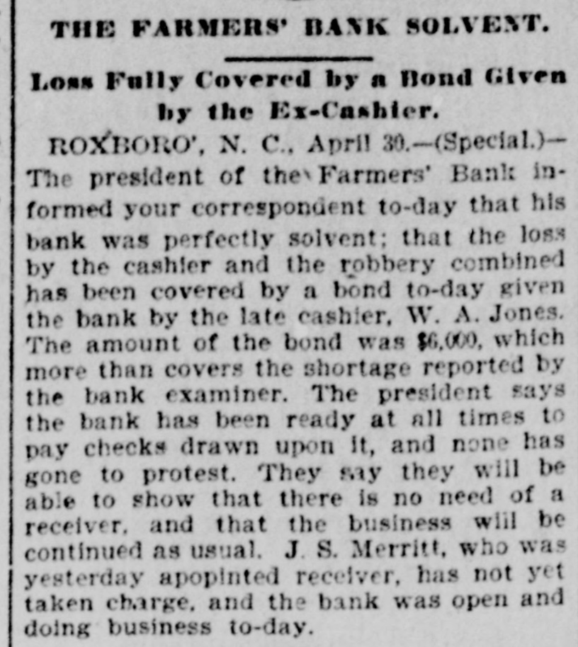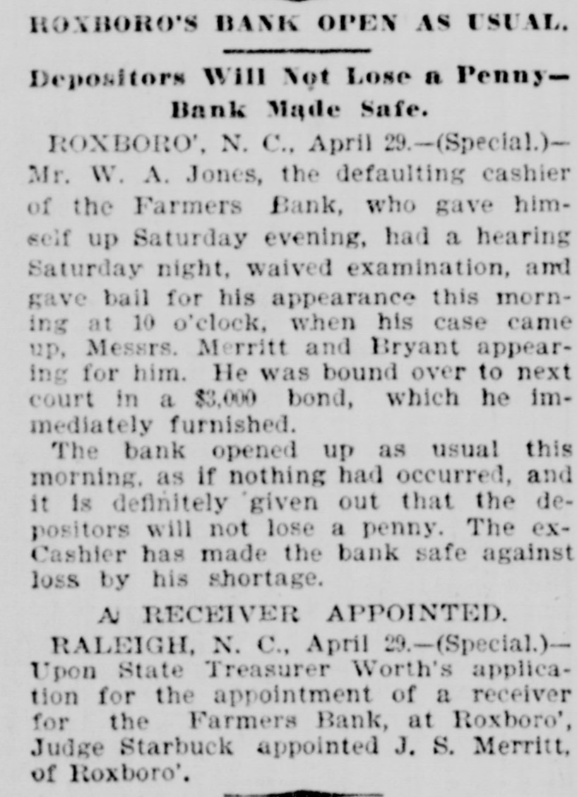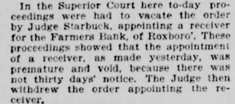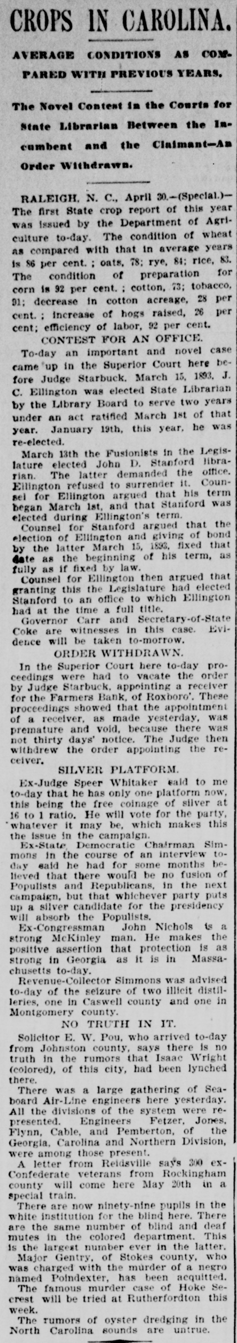 CROPS IN CAROLINA. AVERAGE CONDITIONS AS COMPARED WITH PREVIOUS YEARS. The Novel Contest in the Courts for State Librarian Between the Incumbent and the Claimant-An Order Withdrawn. RALEIGH, N. C., April 30.-(Special.)The first State crop report of this year was issued by the Department of Agriculture to-day. The condition of wheat as compared with that in average years is 86 per cent. : oats, 78; rye, 84; rice, 83. The condition of preparation for corn is 92 per cent. : cotton, 73; tobacco, 91; decrease in cotton acreage, 28 per cent. : increase of hogs raised, 26 per cent; efficiency of labor, 92 per cent. CONTEST FOR AN OFFICE. To-day an important and novel case came up in the Superior Court here before Judge Starbuck. March 15, 1893. J. C. Ellington was elected State Librarian by the Library Board to serve two years under an act ratified March 1st of that year. January 19th, this year, he was re-elected. March 13th the Fusionists in the Legislature elected John D. Stanford librarian. The latter demanded the office. Ellington refused to surrender it. Counsel for Ellington argued that his term began March 1st, and that Stanford was elected during Ellington's term. Counsel for Stanford argued that the election of Ellington and giving of bond by the latter March 15, 1893, fixed that date as the beginning of his term, as fully as if fixed by law. Counsel for Ellington then argued that granting this the Legislature had elected Stanford to an office to which Ellington had at the time a full title. Governor Carr and Secretary-of-State Coke are witnesses in this case. Evidence will be taken to-morrow. ORDER WITHDRAWN. In the Superior Court here to-day proceedings were had to vacate the order by Judge Starbuck, appointing a receiver for the Farmers Bank, of Roxboro'. These proceedings showed that the appointment of a receiver, as made yesterday, was premature and void, because there was not thirty days' notice. The Judge then withdrew the order appointing the receiver. SILVER PLATFORM. Ex-Judge Speer Whitaker said to me to-day that he has only one platform now, this being the free coinage of silver at 16 to 1 ratio. He will vote for the party, whatever it may be, which makes this the issue in the campaign. Ex-State Democratic Chairman Simmons in the course of an interview today said he had for some months believed that there would be no fusion of Populists and Republicans, in the next campaign, but that whichever party puts up a silver candidate for the presidency will absorb the Populists. Ex-Congressman John Nichols is a strong McKinley man. He makes the positive assertion that protection is as strong in Georgia as it is in Massachusetts to-day. Revenue-Collector Simmons was advised to-day of the seizure of two illicit distilleries, one in Caswell county and one in Montgomery county. NO TRUTH IN IT. Solicitor E. W. Pou, who arrived to-day from Johnston county, says there is no truth in the rumors that Isaac Wright (colored), of this city, had been lynched there. There was a large gathering of Seaboard Air-Line engineers here yesterday. All the divisions of the system were represented. Engineers Fetzer, Jones, Flynn, Cable, and Pemberton, of the Georgia, Carolina and Northern Division, were among those present. A letter from Reidsville says 300 exConfederate veterans from Rockingham county will come here May 20th in a special train. There are now ninety-nine pupils in the white institution for the blind here. There are the same number of blind and deaf mutes in the colored department. This is the largest number ever in the latter. Major Gentry, of Stokes county, who was charged with the murder of a negro named Poindexter, has been acquitted. The famous murder case of Hoke Secrest will be tried at Rutherfordton this week. The rumors of oyster dredging in the North Carolina sounds are untrue.