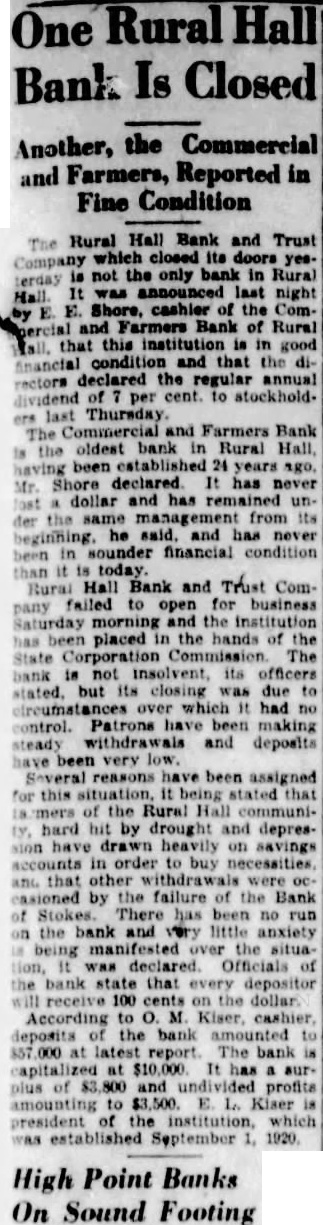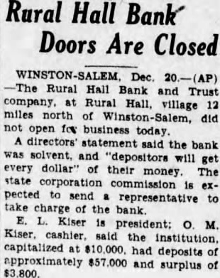 RURAL HALL N. C., Dec. The Rural Hall Bank Trust Company did not open for business today. E. L. Kiser is president. O. M. Kiser is eashier and said the institution, capitalized at $10,000. had posits of approximately $57,000 and surplus of $3,800.