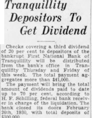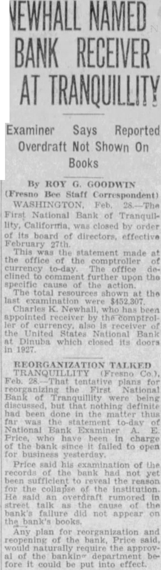 NEWHALL NAMED BANK RECEIVER AT TRANQUILLITY Examiner Says Reported Overdraft Not Shown On Books By ROY G. GOODWIN (Fresno Staff Correspondent) WASHINGTON Feb. First National Bank of Tranquillity, Califormia, was closed by order of its board of directors, effective This the statement made the office of the comptroller currency The office clined comment further upon the cause the action at the Charles K. Newhall, by the comptrol of also the United States National Bank Dinuba which closed its doors in 1927 TALKED Feb. That tentative plans the First National Bank of were being but that definite been done the far the statement to-day National Bank Examiner Price, have charge the bank since falled to open for business yesterday. Price said his examination of the records the bank had not yet the reason the collapse the institution. an rumored street talk as the of the bank's failure did not appear on the bank's books. Any plan for reorganization and the bank Price said, would require the approvof the before it could be put into effect