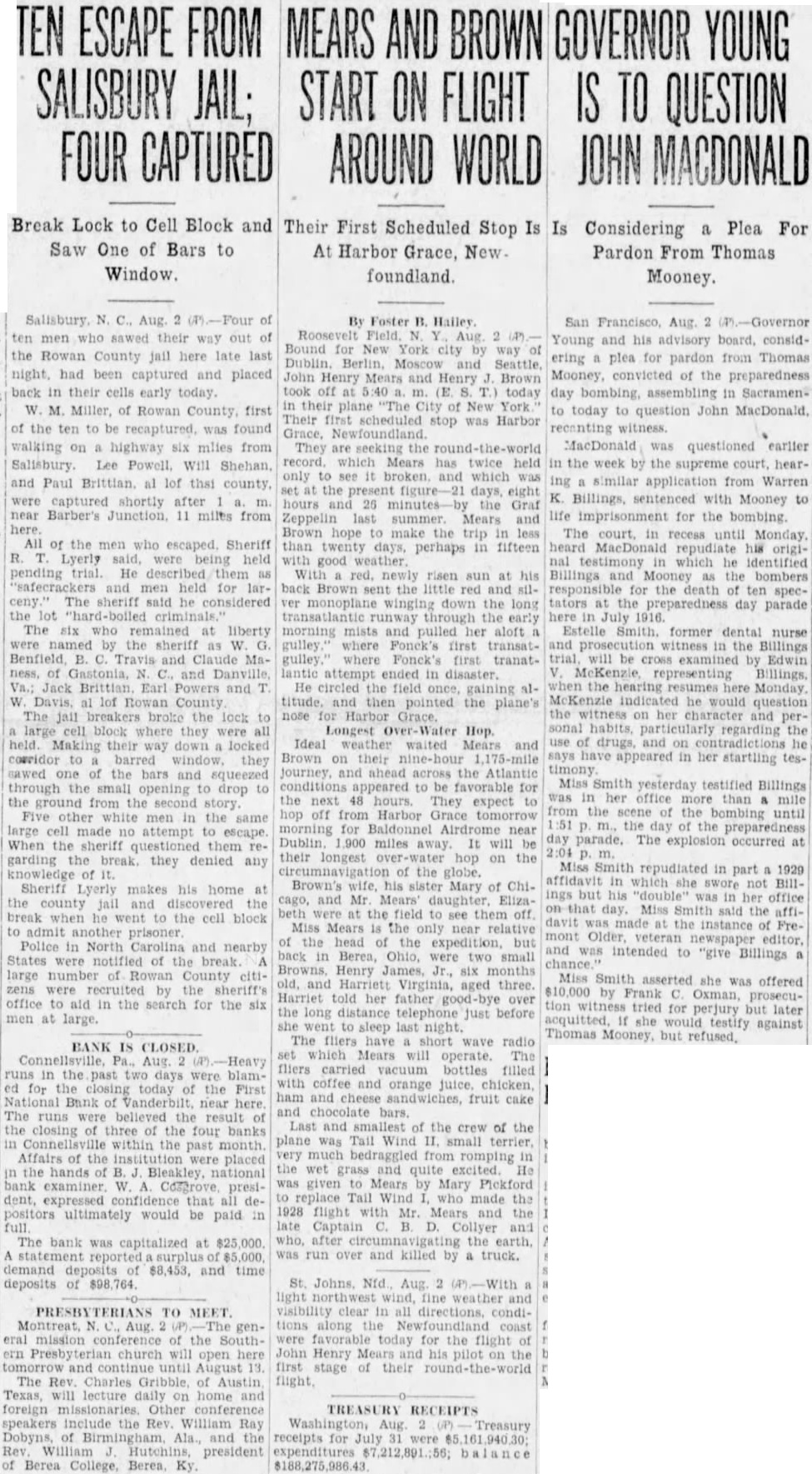 TEN ESCAPE FROM SALISBURY JAIL; FOUR CAPTURED MEARS AND BROWN START ON FLIGHT AROUND WORLD GOVERNOR YOUNG IS TO QUESTION JOHN Break Lock to Cell Block and Their First Scheduled Stop Is Is Considering a Plea For Saw One of Bars to At Harbor Grace, New. Pardon From Thomas Window. foundland. Mooney. Salisbury, N. Aug. ten men their way out the Rowan County here late last night, had placed back in cells early of Rowan County, first the ten recaptured, was found walking highway mlies from Salisbury Will and Paul Brittian. lof shortly after Barber's miles All of the who Sheriff Lyerly being pending held sheriff said The at liberty Earl Powers and the Making locked barred one the through drop the the When garding they denied any knowledge Sheriff Lyerly makes home the county and the break when he went to the cell block to admit another prisoner Police North Carolina and nearby were of the citioffice in the search for the six men at large. BANK IS CLOSED. Aug. in the past two days were blamfor the closing today of the First near The runs the the closing three the four within the past Affairs of the placed the hands Bleakley examiner expressed that all depositors ultimately would be paid The bank capitalized at demand $8,453, and time deposits TO MEET mission conference of the Southern church will open and The Rev. Charles Austin Texas, will lecture foreign speakers include Rev. William Ray Dobyns, William Hutchins, president of Berea College, By Foster Hailey. Field. Bound for York city by Dublin. and Brown off today "The New Their stop was Harbor They are seeking the which Mears twice held and which days, 26 minutesZeppelin summer. Mears trip perhaps in fifteen good sun his Brown and winging down the through morning mists her aloft Fonck's transatFonck's tranatthe plane's Longest Hop. Ideal weather waited Mears and Brown on and ahead the Atlantic for the expect Harbor tomorrow Dublin miles will be on the the Brown's his sister Mary ChiMr. see them off Miss Mears is the near the but back Berea, Ohio, Henry six and Virginia, aged three Harriet her father over the long distance telephone just before sleep last night. fliers short wave Mears will operate. bottles with coffee and orange ham and fruit cake and smallest of the crew of the was Wind small very romping the wet grass was given Mears Mary Pickford replace Wind who made the 1928 flight Mr. Mears and the Captain Collyer the was run over and killed by truck. St. Aug weather and visibility clear in directions. condialong Newfoundland coast favorable today for the flight Henry pilot the first stage round-the-world flight TREASURY RECEIPTS Washington, Aug receipts for $188,275,986.43 San Aug. Young and his advisory board, considering plea for pardon Thomas Mooney, of the preparedness day Sacramento today question John witness. MacDonald was questioned earlier the week by the supreme hearing similar application from Warren with Mooney to life for the bombing. The MacDonald repudiate his origiidentified Billings Mooney the bombers ten spectators the day parade Estelle former dental nurse and the be Edwin hearing McKenzie he would question the on character and habits particularly regarding the use drugs, and her startling tesMiss Smith yesterday testified Billings was than the the the preparedness day parade. The explosion occurred at Miss Smith repudiated in part 1929 in she not Billings her Miss said the the instance of and was intended to "give Billings chance. Miss Smith asserted she was offered $10,000 by Oxman, prosecutried for perjury she against Thomas but refused.