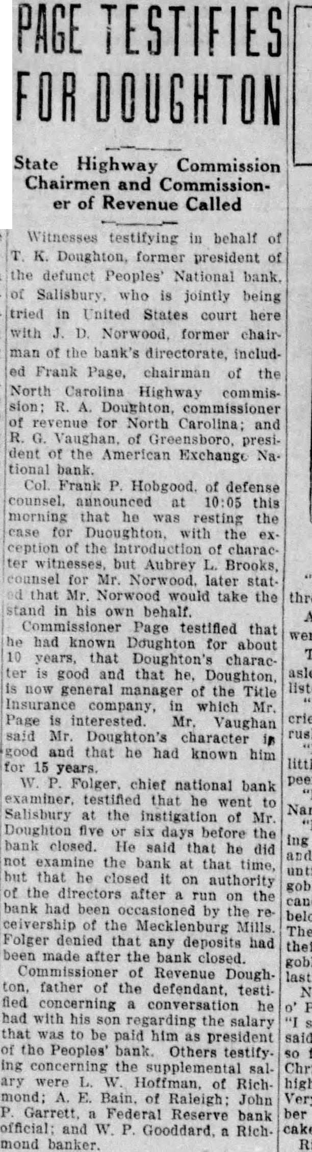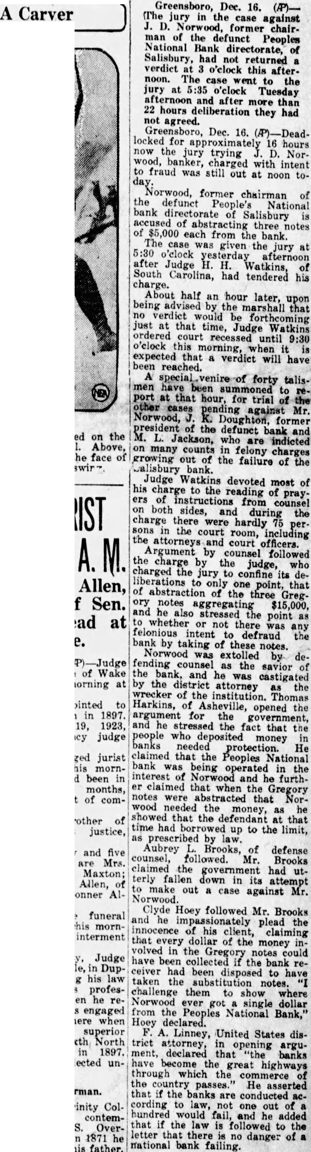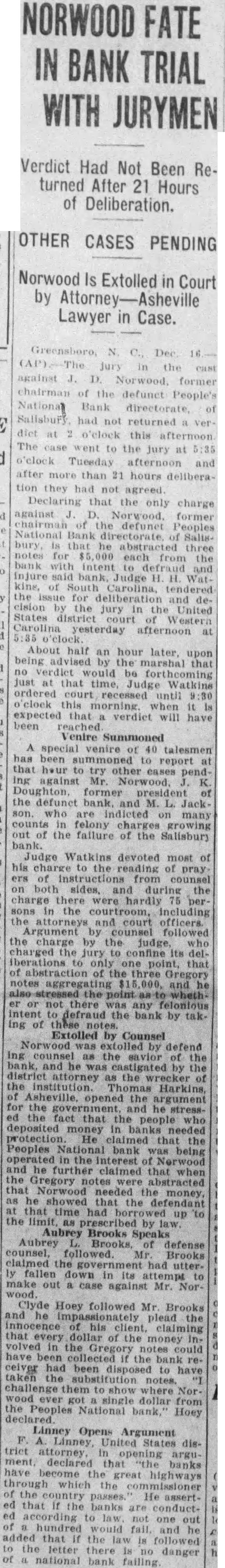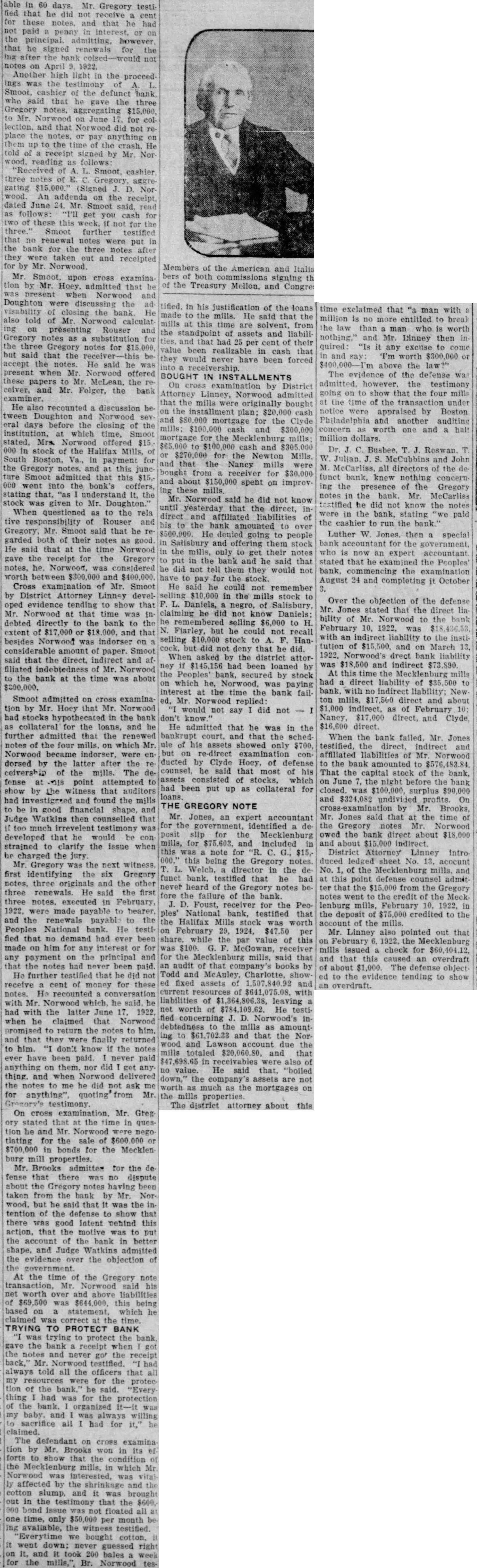 able in 60 days. Mr. Gregory testified that he did not receive cent for these notes, and that he had not paid penny or on the principal. admitting, however that he signed renewals the ing after the bank not notes on April 1922. Another high light in the proceedings was the of Smoot, cashier of the defunct bank who said that he gave the three Gregory notes, aggregating $15,000. Mr. Norwood on June 17. for collection, and that Norwood did not replace the notes, or pay anything them up to the time of the crash. He told of receipt signed by Mr. Nor wood, reading as follows "Received of Smoot, cashier three notes of Gregory aggre gating $15,000." (Signed D. Nor wood. An addenda on the receipt, dated June Mr. Smoot read follows: "I'll get you for cash of these this not for the three." Smoot further testified that no renewal notes were put the bank for the three notes after they were taken out and receipted for by Mr Norwood. Mr. Smoot. upon cross examination by Mr. Hoey. admitted that present when Norwood and Doughton were discussing the advisability of closing the bank. He also told of Mr calculat ing on présenting Rouser and Gregory notes as substitution the three Gregory notes for $15,000, but said that the beaccept the notes. He said he was present when Mr. Norwood offered these papers to Mr McLean, the ceiver, and Mr. Folger, the bank examiner. He also recounted discussion be tween Doughton and Norwood eral days before the closing of the institution, at which time, Smoot stated, Mrs. Norwood offered $15. 000 in stock of the Halifax Mills, of South Boston, Va., in payment for the Gregory notes, and this june ture Smoot admitted that this $15, 000 went into the bonk's coffers, stating that, "as understand it. the stock was given to Mr. Doughton.' When questioned as to the rela tified. in his justification of the loans made to the mills. He said that the mills at this time are solvent, from the standpoint of assets and liabilities, and that had 25 per cent of their value been realizable in cash that they would never have been forced receivership. BOUGHT IN INSTALLMENTS On cross examination by District Attorney Linney, Norwood admitted that the mills were originally bought the installment plan: cash and mortgage for the Clyde mills; cash and $300,000 mortgage for the mills; cash and $270,000 for the Newton Mills, and that the Nancy mills were bought from receiver for $30,000 and about $150,000 spent on improvthese mills Mr. Norwood said he did not know until yesterday that the direct, direct and affiliated liabilities of his to the bank amounted to over $500,000. He denied going to people Salisbury and offering them stock the mills, only to get their notes put in the bank and he said that did not tell them they would not to pay for the stock. He said he could not remember selling in the mills stock to L. Daniels, negro, of Salisbury, claiming he did not know Daniels: remembered selling $6,000 to H. Fiarley, but he could not recall selling $10,000 stock to Hancock. but did not deny that he did. When asked by the district attorney if had been loaned by the Peoples' bank, secured by stock which he, Norwood. was paying interest the time the bank failMr Norwood replied: would not say did not don't know. He admitted that he was in the bankrupt court, and that the schedof his assets showed $700. but on re-direct examination conducted by Clyde Hoey, of defense counsel, be said that most of his assets consisted of stocks, which had been put up as collateral for loans THE GREGORY NOTE