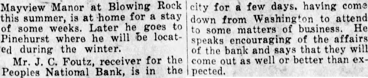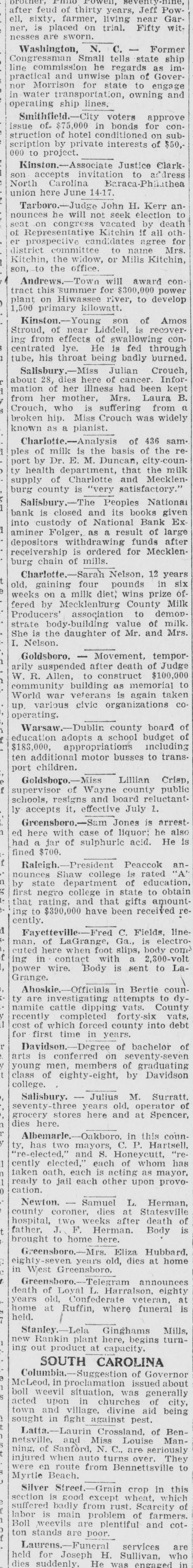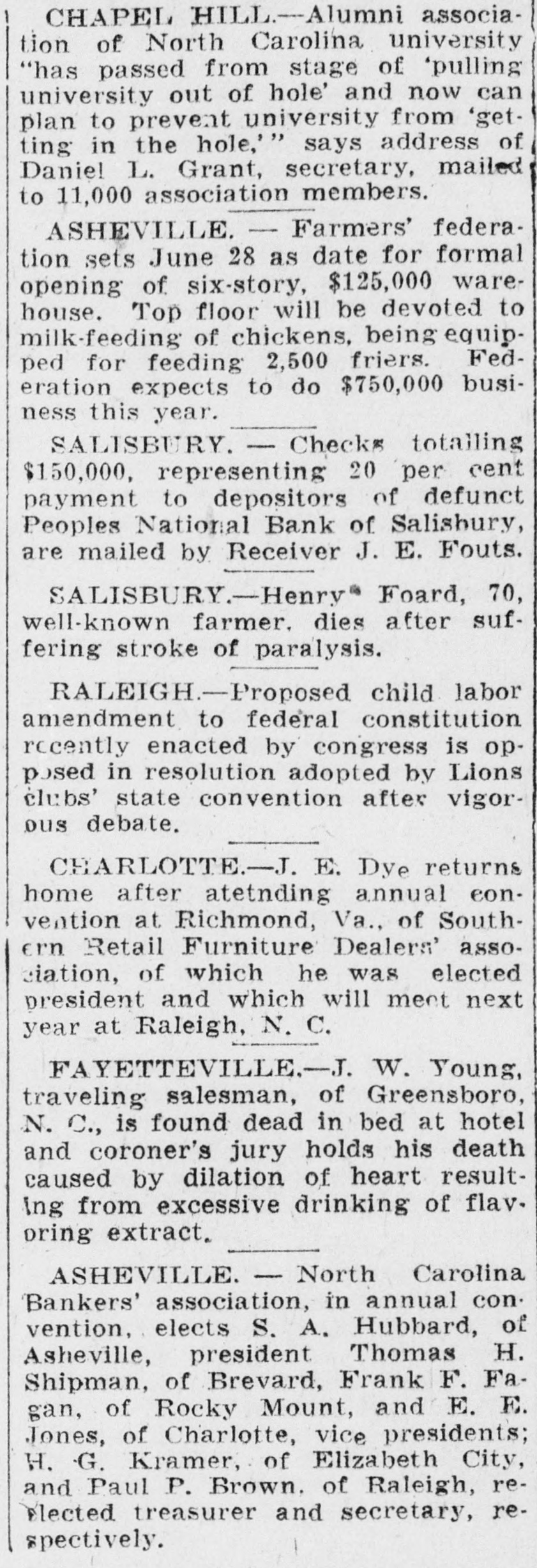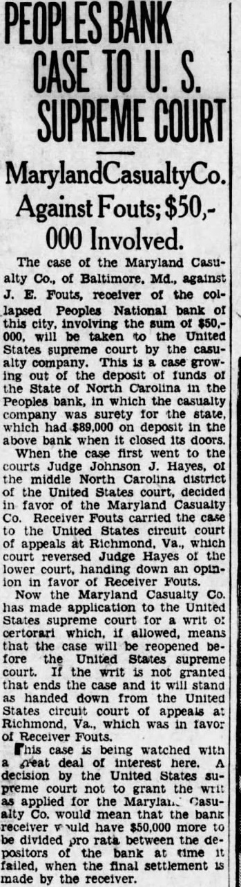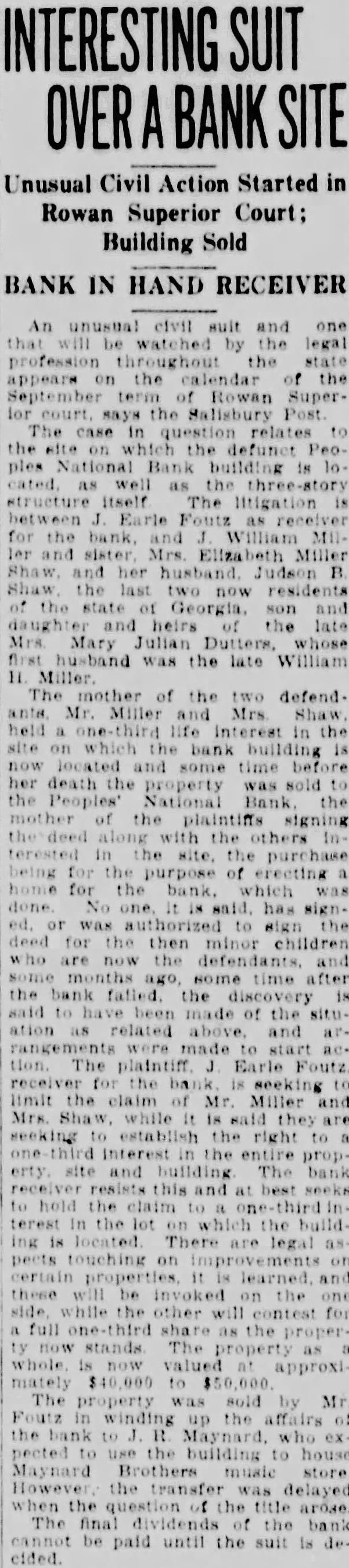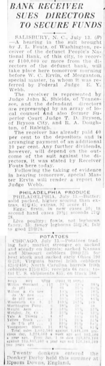 able in 60 days. Mr. Gregory testified that he did not receive cent for these notes, and that he had not paid penny or on the principal. admitting, however that he signed renewals the ing after the bank not notes on April 1922. Another high light in the proceedings was the of Smoot, cashier of the defunct bank who said that he gave the three Gregory notes, aggregating $15,000. Mr. Norwood on June 17. for collection, and that Norwood did not replace the notes, or pay anything them up to the time of the crash. He told of receipt signed by Mr. Nor wood, reading as follows "Received of Smoot, cashier three notes of Gregory aggre gating $15,000." (Signed D. Nor wood. An addenda on the receipt, dated June Mr. Smoot read follows: "I'll get you for cash of these this not for the three." Smoot further testified that no renewal notes were put the bank for the three notes after they were taken out and receipted for by Mr Norwood. Mr. Smoot. upon cross examination by Mr. Hoey. admitted that present when Norwood and Doughton were discussing the advisability of closing the bank. He also told of Mr calculat ing on présenting Rouser and Gregory notes as substitution the three Gregory notes for $15,000, but said that the beaccept the notes. He said he was present when Mr. Norwood offered these papers to Mr McLean, the ceiver, and Mr. Folger, the bank examiner. He also recounted discussion be tween Doughton and Norwood eral days before the closing of the institution, at which time, Smoot stated, Mrs. Norwood offered $15. 000 in stock of the Halifax Mills, of South Boston, Va., in payment for the Gregory notes, and this june ture Smoot admitted that this $15, 000 went into the bonk's coffers, stating that, "as understand it. the stock was given to Mr. Doughton.' When questioned as to the rela tified. in his justification of the loans made to the mills. He said that the mills at this time are solvent, from the standpoint of assets and liabilities, and that had 25 per cent of their value been realizable in cash that they would never have been forced receivership. BOUGHT IN INSTALLMENTS On cross examination by District Attorney Linney, Norwood admitted that the mills were originally bought the installment plan: cash and mortgage for the Clyde mills; cash and $300,000 mortgage for the mills; cash and $270,000 for the Newton Mills, and that the Nancy mills were bought from receiver for $30,000 and about $150,000 spent on improvthese mills Mr. Norwood said he did not know until yesterday that the direct, direct and affiliated liabilities of his to the bank amounted to over $500,000. He denied going to people Salisbury and offering them stock the mills, only to get their notes put in the bank and he said that did not tell them they would not to pay for the stock. He said he could not remember selling in the mills stock to L. Daniels, negro, of Salisbury, claiming he did not know Daniels: remembered selling $6,000 to H. Fiarley, but he could not recall selling $10,000 stock to Hancock. but did not deny that he did. When asked by the district attorney if had been loaned by the Peoples' bank, secured by stock which he, Norwood. was paying interest the time the bank failMr Norwood replied: would not say did not don't know. He admitted that he was in the bankrupt court, and that the schedof his assets showed $700. but on re-direct examination conducted by Clyde Hoey, of defense counsel, be said that most of his assets consisted of stocks, which had been put up as collateral for loans THE GREGORY NOTE