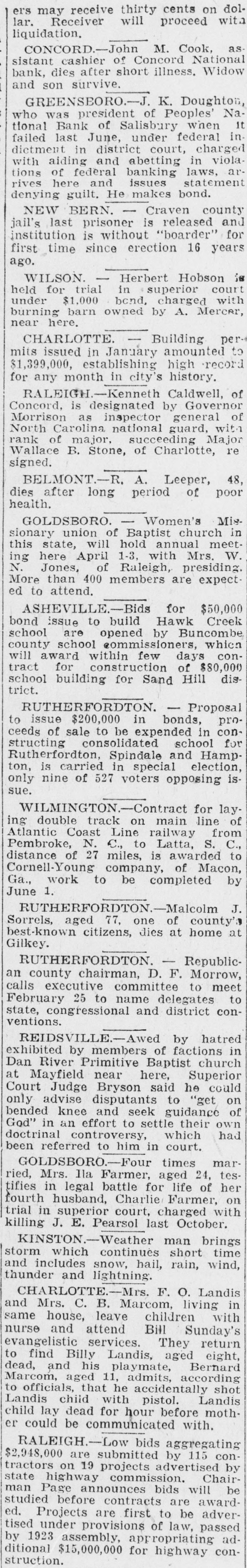 Over the objection of the defense Mr. Jones stated that the direct lia bility of Mr. Norwood to the bank February 10. 1922, was with an indirect liability to the insti tution of $15,500. and on March 13, 1922, Norwood's drect bank liability was $18,500 and indirect $73,890. At this time the Mecklenburg mills had a direct liability of to bank. with indirect liability; New ton mlils, $17,560 direct and about indirect, as of February 10: Nancy, $17,000 direct, and Clyde $16,600 direct. When the bank failed. Mr. Jones testified, the direct. indirect and affiliated liabilities of Mr. Norwood to the bank amounted to That the capital stock of the bank, on June the night before the bank closed. was $100,000 surplus and $324,082 undivided profits. On by Mr. Brooks, Mr. Jones said that at the time of the Gregory notes Mr. Norwood owed the bank direct about $18,000 and about $15,000 indirect. District Attorney Linney intro duced ledged sheet No. 13, acocunt No. of the Mecklenburg mills. and at this point defense counsel admit ter that the $15,000 from the Gregory notes went to the credit of the Meck lenburg mills, February 10, 1922, in the deposit of $75,000 credited to the account the mills. Mr. Linney also pointed out that February 1922, the Mecklenburg mills issued check for and that this caused an overdraft of about $1,000. The defense object ed to the evidence tending to show overdraft.