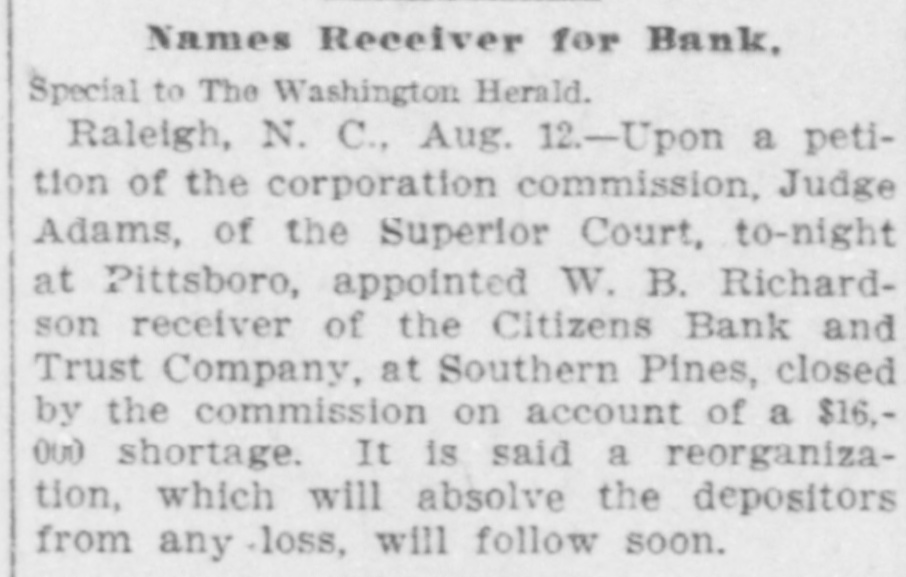 CITIZENS' BANK CLOSES AT SOUTHERN PINES RALEIGH, N. C., Aug. 2.-State Bank Examiner J. K. Doughton closed the Citizens' Bank and Trust company at Southern Pines today by order of the corporation commission, on account of an alleged shortage of $15,000 discovered since Cashier George A. Kimball left, July 17, for his vacation to be spent, he said, at York Beach, Maine. The bank's capital is only $10,000, with $32,000 deposits. All efforts made thus far failed. A receiver will be appointed.