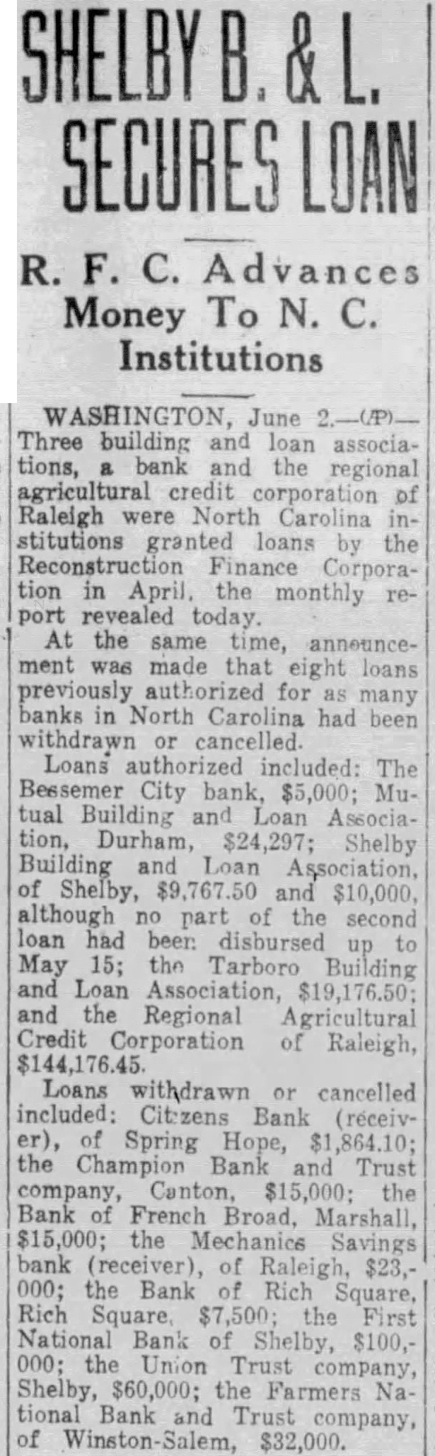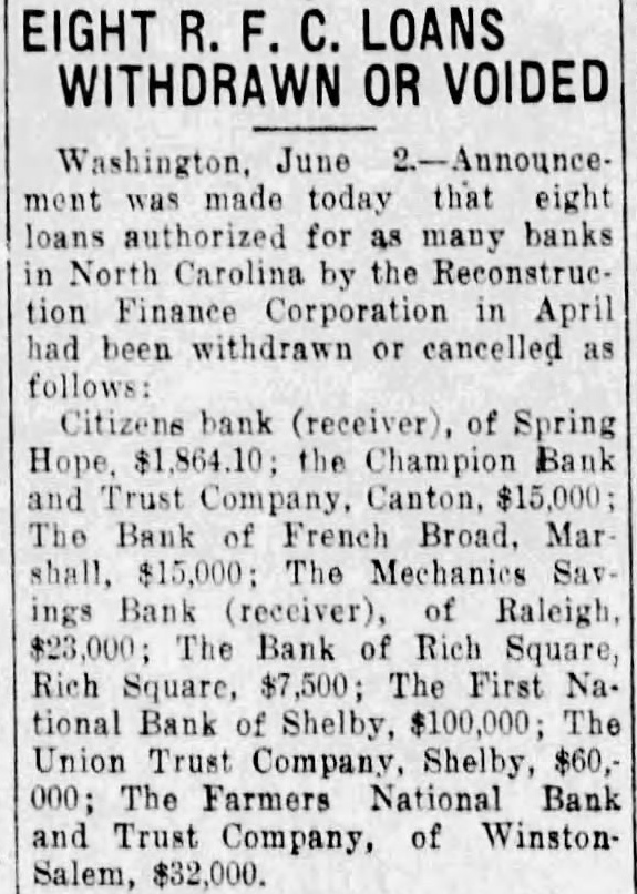 MILLION FUNDS LOANED TO March more dollars author ized for North Carolina tions by the in January. The list: Cumberland National bank Fayetteville (receiver), Gaston Trust Gastonia, $7,000; United and Trust of company, boro, Bank of Mocksville, $9,000 and Bank Mount Airy, Mount $60,000; the Bank of Mount Mount Gilead, $6,000; Old Fort, (receiver) Old $8,500; Mechanics Savings (receiver) Raleigh, $23,000; Peoples Bank, the First bank Shelby, Citizens (receiver), Spring Hope, Farmers and Merchants Stanley $5,175; Peoples Loan Savings bank, Statesville, 000; Atlantic Joint Stock bank, Raleigh, the Carolina Joint Stock bank Durham, $206,000; High Perpetual Building and Loan sociation, High Point, $6,444. loan of previously thorized for the Bank of Hunters. ville, Huntersville, was cancelled by the bank.