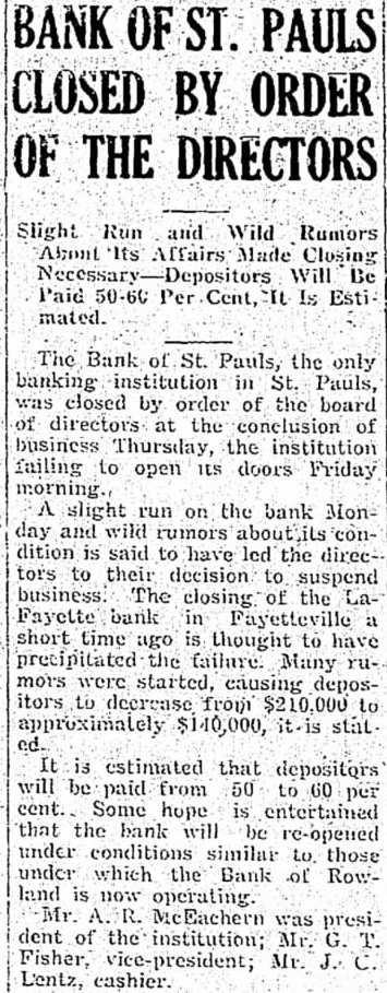 The Bank of St. Pauls, the only banking institution St. Pauls, closed by order of the board directors the conclusion of business Thursday, the failing to open doors Friday morning. slight run on the bank Monday and wild rumors dition is said to have led the tors to their decision suspend business. The closing the Fayette bank short time ago is thought to have precipitated the failure. Many mors started, causing depositors to decrease from stat estimated that depositors will from 50 60 per cent. Some hope entertained that the bank will be re-opened under similar those under which the Bank of Rowland now operating. McEachern was dent of the institution; Mr. Fisher, cashier.