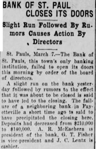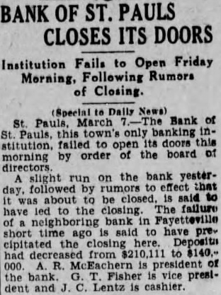 St. Pauls, March Bank of St. Pauls, this town's only banking institution, failed to open its doors this morning by order of the board directors. A slight run on the bank yester day followed by to the effect that it was about to be closed is said to have led the closing. The failure of neighboring bank in Fay etteville short time ago is said to have precipitated the closing here. Deposits had from $210,000 to $140,000. A. R. McEachern president the bank, G. T. Fisher is vice president and J. C. Lentz is