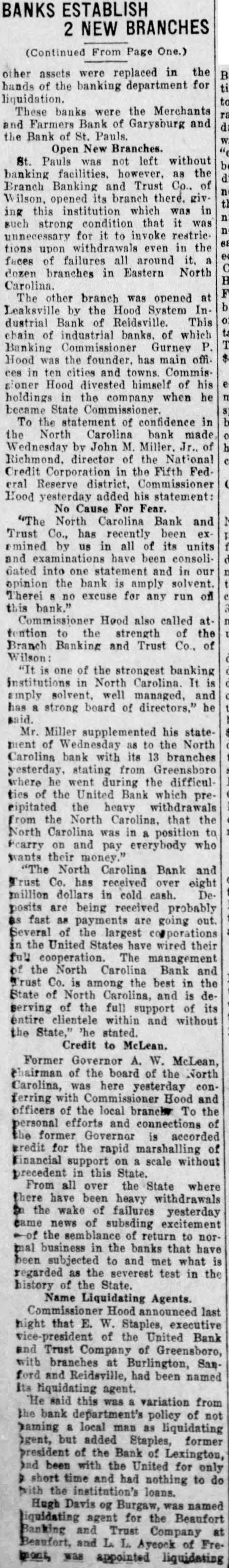 BANKS ESTABLISH NEW BRANCHES (Continued From Page One.) other assets were replaced in the hands the banking department for liquidation. These banks were the Merchants and Farmers Bank of Garysburg and the Bank of Pauls. Open New Branches. St. Pauls not left without banking facilities. as the Branch Banking and Trust Wilson. opened its branch there. giv ing this institution which was in strong that was unnecessary for to restrietions withdrawals even in the faces of failures around dozen branches in Eastern North Carolina. The other branch was opened at Leaksville by the Hood System In dustrial Bank Reidsville. This chain industrial of which Banking Commissioner Gurney Hood the founder. has main offi. ces ten cities and towns. Commiscioner Hood divested himself of his holdings the company when he became State To the statement of confidence in the North Carolina bank made Wednesday by John M. Miller. Richmond. director of the National Credit Corporation the Fifth Fed. Reserve district, Commissioner Hood yesterday added his statement: Cause For Fear. "The North Carolina Bank and Trust has recently been amined by us in all of its units and examinations have been consolidated and in our opinion the bank amply solvent. Therei no excuse for any run on this bank." Commissioner Hood also called at. tention strength the Branch Banking and Trust Co., Wilson: "It one of the strongest banking Institutions North Carolina It well managed, strong board of directors," said. Mr. Miller supplemented his statement the North Carolina bank with its 13 branches yesterday, stating from where went the difficul ties of the United Bank which prethe heavy from the North Carolina, that the North Carolina was Pearry on and pay everybody who wants their money." "The North Carolina Bank and Trust Co. has received over eight million dollars cold cash. Deposits are being probably fast as are going out. Several of the largest the United States wired their full The the North Carolina Bank and Trust Co. among the best in the State North and deserving of the full support of its entire within and without the State," 'he stated. Credit to McLean. Former A. W. McLean, chairman of the board of the North Carolina, was here yesterday ferring with and officers of the local branch To the personal efforts and the gredit for the rapid of financial support scale without precedent this From all over the State where have been heavy withdrawals the wake of failures yesterday came of subsding excitement the return to nor mal business the banks that have subjected to and met what regarded as the severest test in the history the State. Name Liquidating Agents. Hood last hight that E. W. Staples, of the United Bank and Trust Company of at San ford and Reidsville, had been named Its agent. He said this was variation from the bank department's policy not Daming local man as liquidating agent, but added Staples, former president of the Bank of Lexington, and been with the United for only short time and had nothing to do the institution's loans. Hugh Davis og Burgaw, was named liquidating agent for the Beaufort Banking Trust Company Beaufort, and Ayeock Freliquidating