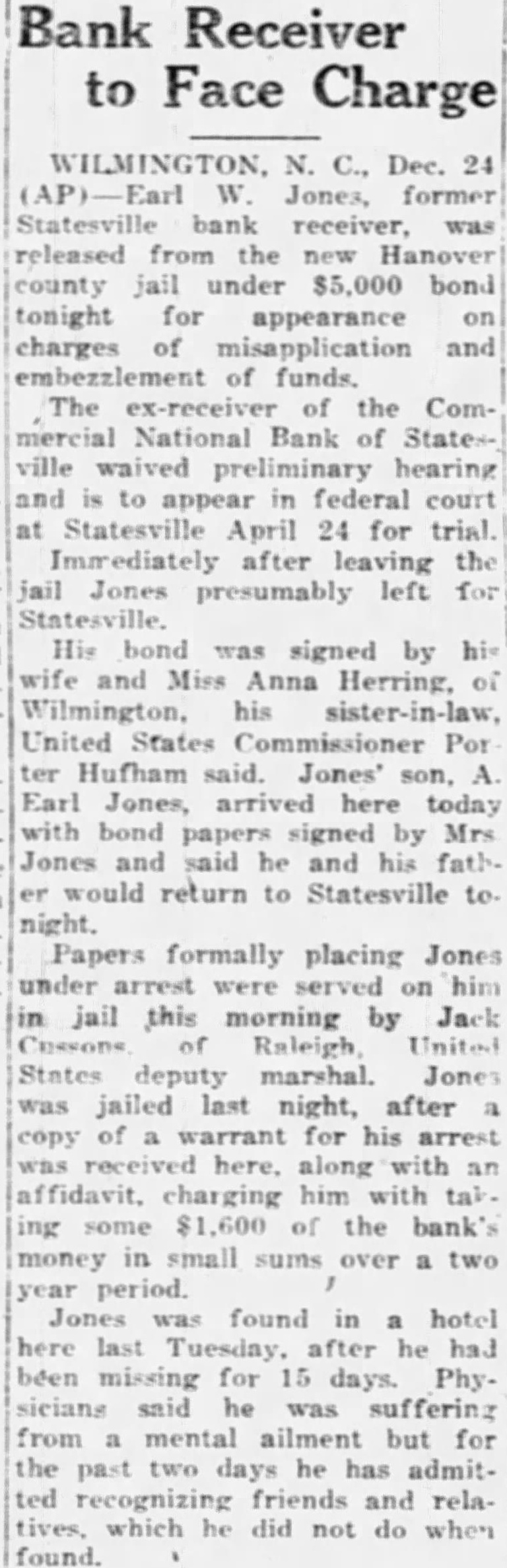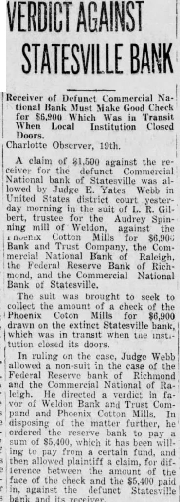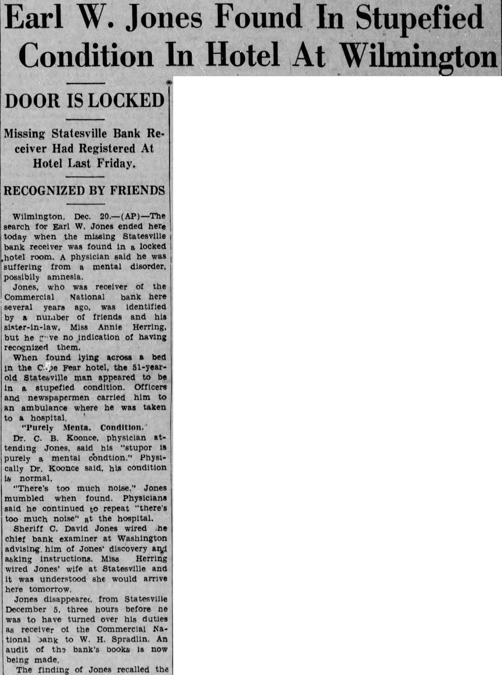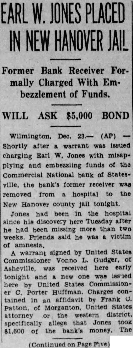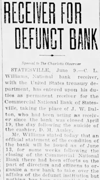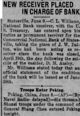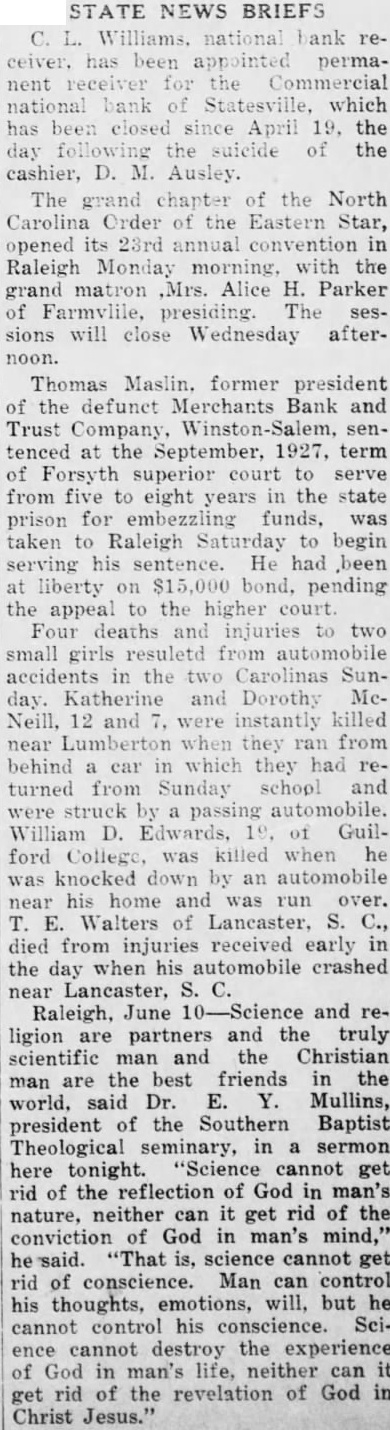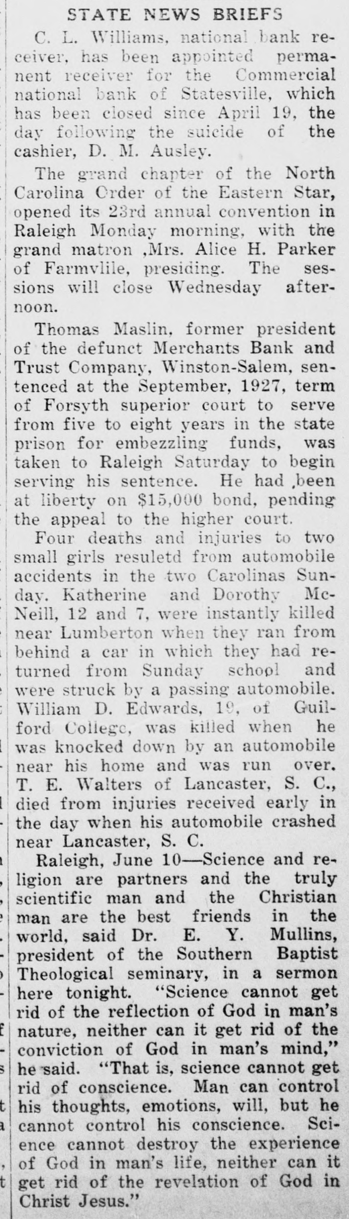 STATE NEWS BRIEFS C. L. Williams, national bank receiver, has been appointed permanent receiver for the Commercial national bank of Statesville, which has been closed since April 19, the day following the suicide of the cashier, D. M. Ausley. The grand chapter of the North Carolina Order of the Eastern Star, opened its 23rd annual convention in Raleigh Monday morning, with the grand matron ,Mrs. Alice H. Parker of Farmvlile, presiding. The sessions will close Wednesday afternoon. Thomas Maslin, former president of the defunct Merchants Bank and Trust Company, Winston-Salem, sentenced at the September, 1927, term of Forsyth superior court to serve from five to eight years in the state prison for embezzling funds, was taken to Raleigh Saturday to begin serving his sentence. He had been at liberty on $15,000 bond, pending the appeal to the higher court. Four deaths and injuries to two small girls resuletd from automobile accidents in the two Carolinas Sunday. Katherine and Dorothy McNeill, 12 and 7, were instantly killed near Lumberton when they ran from behind a car in which they had returned from Sunday school and were struck by a passing automobile. William D. Edwards, 19, of Guilford College, was killed when he was knocked down by an automobile near his home and was run over. T. E. Walters of Lancaster, S. C., died from injuries received early in the day when his automobile crashed near Lancaster, S. C. Raleigh, June 10-Science and religion are partners and the truly scientific man and the Christian man are the best friends in the world, said Dr. E. Y. Mullins, president of the Southern Baptist Theological seminary, in a sermon here tonight. "Science cannot get rid of the reflection of God in man's nature, neither can it get rid of the conviction of God in man's mind," he said. "That is, science cannot get rid of conscience. Man can control his thoughts, emotions, will, but he cannot control his conscience. Science cannot destroy the experience of God in man's life, neither can it get rid of the revelation of God in Christ Jesus."