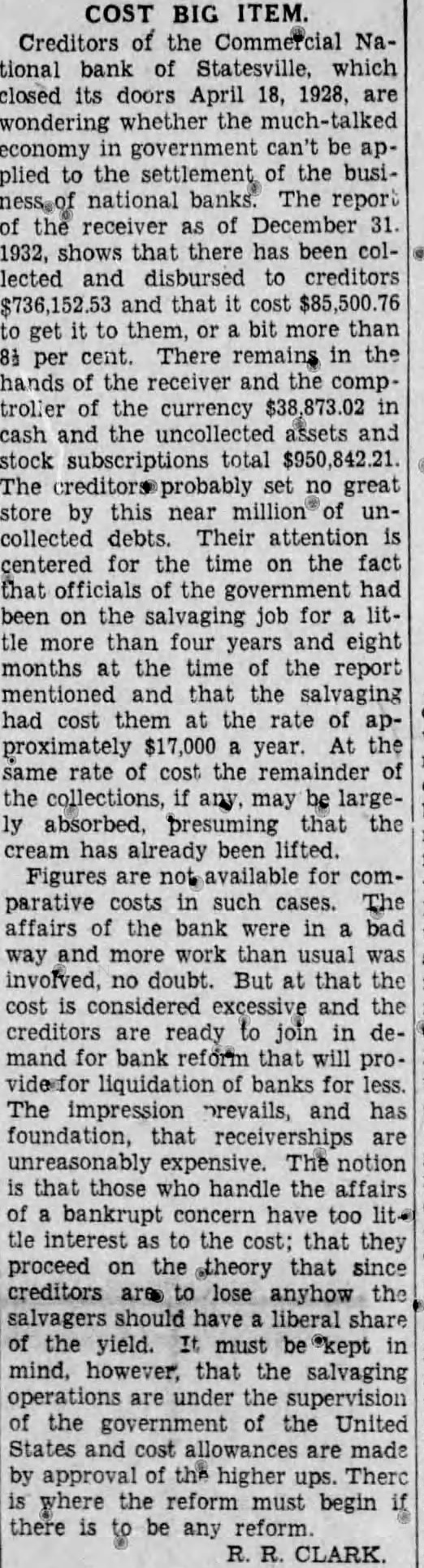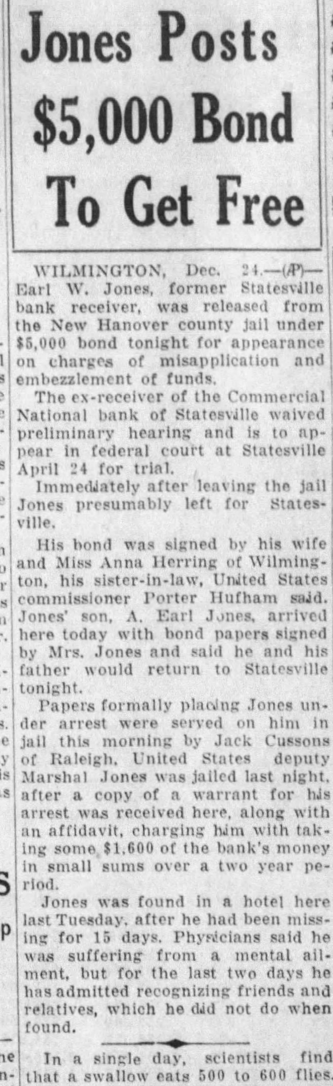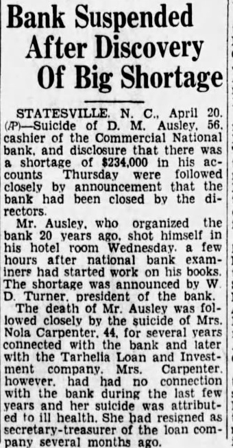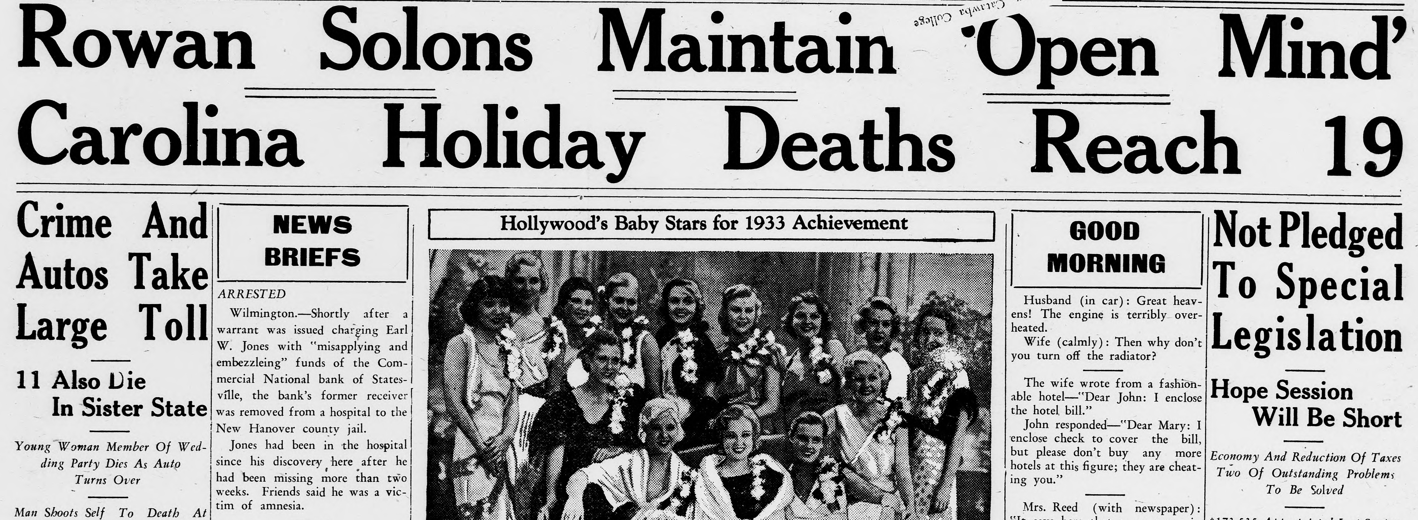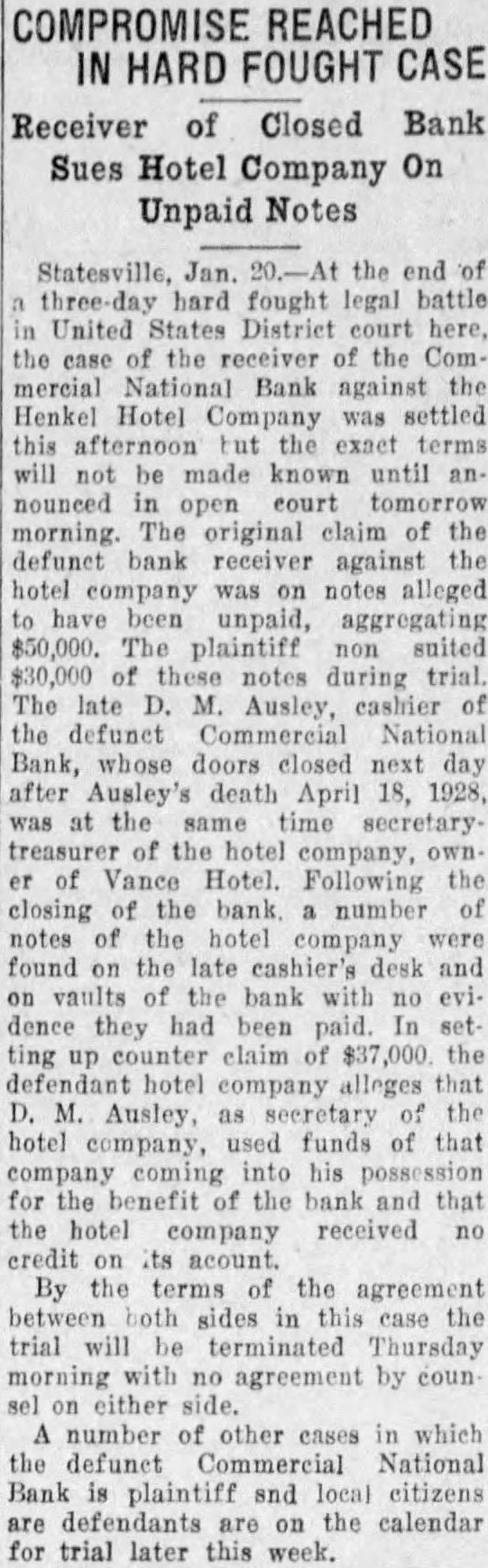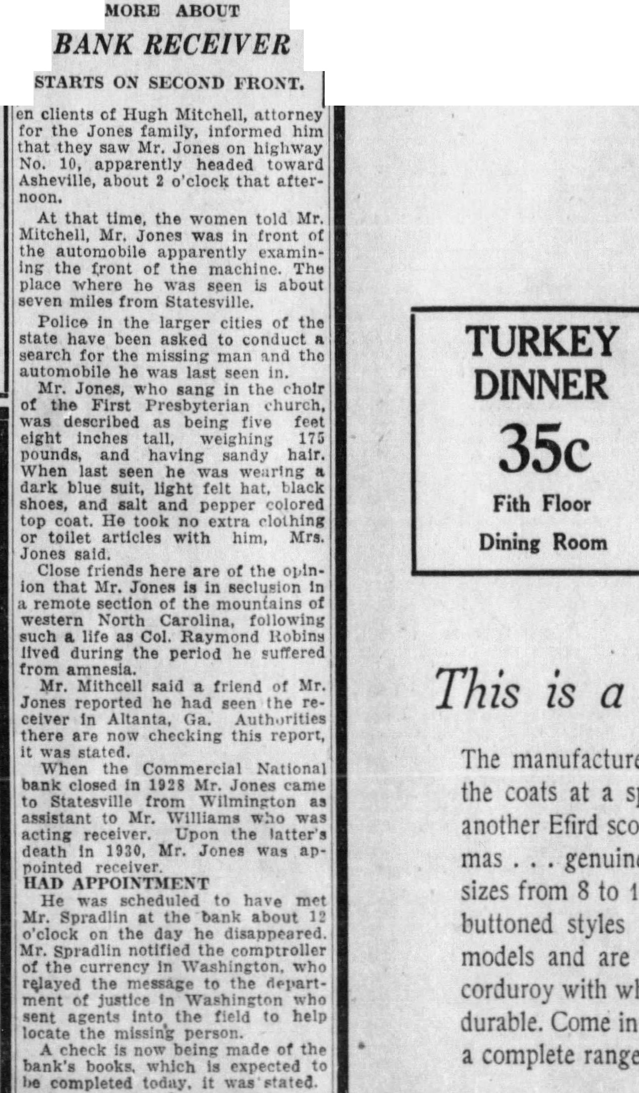 STATE NEWS BRIEFS C. L. Williams, national bank receiver, has been appointed permanent receiver for the Commercial national bank of Statesville, which has been closed since April 19, the day following the suicide of the cashier, D. M. Ausley. The grand chapter of the North Carolina Order of the Eastern Star, opened its 23rd annual convention in Raleigh Monday morning, with the grand matron ,Mrs. Alice H. Parker of Farmvlile, presiding. The sessions will close Wednesday afternoon. Thomas Maslin, former president of the defunct Merchants Bank and Trust Company, Winston-Salem, sentenced at the September, 1927, term of Forsyth superior court to serve from five to eight years in the state prison for embezzling funds, was taken to Raleigh Saturday to begin serving his sentence. He had been at liberty on $15,000 bond, pending the appeal to the higher court. Four deaths and injuries to two small girls resuletd from automobile accidents in the two Carolinas Sunday. Katherine and Dorothy McNeill, 12 and 7, were instantly killed near Lumberton when they ran from behind a car in which they had returned from Sunday school and were struck by a passing automobile. William D. Edwards, 19, of Guilford College, was killed when he was knocked down by an automobile near his home and was run over. T. E. Walters of Lancaster, S. C., died from injuries received early in the day when his automobile crashed near Lancaster, S. C. Raleigh, June 10-Science and religion are partners and the truly scientific man and the Christian man are the best friends in the world, said Dr. E. Y. Mullins, president of the Southern Baptist Theological seminary, in a sermon here tonight. "Science cannot get rid of the reflection of God in man's nature, neither can it get rid of the conviction of God in man's mind," he said. "That is, science cannot get rid of conscience. Man can control his thoughts, emotions, will, but he cannot control his conscience. Science cannot destroy the experience of God in man's life, neither can it get rid of the revelation of God in Christ Jesus."
