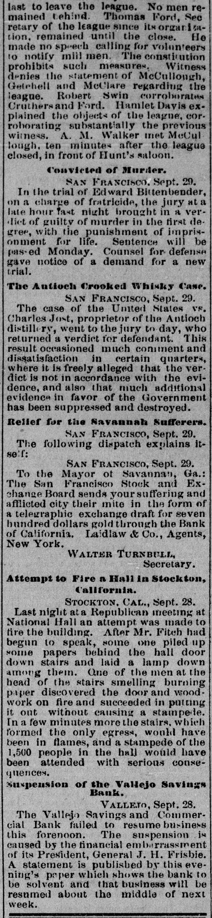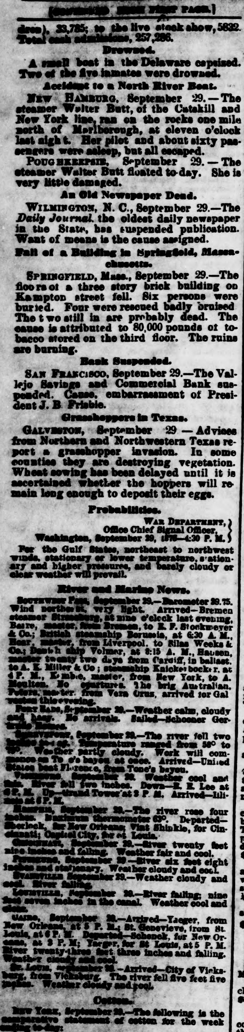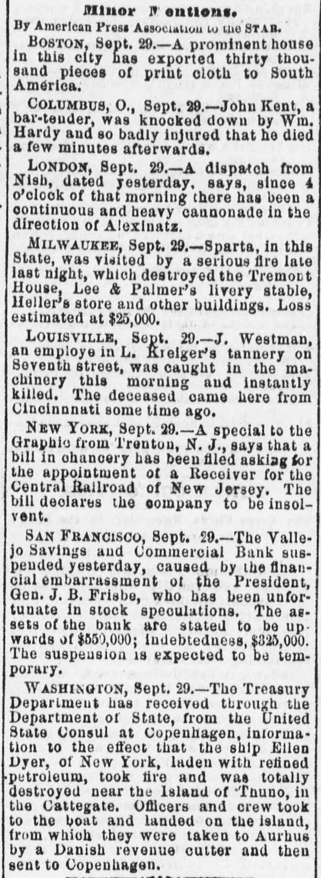 Minor Ventions. By American Press Association to the STAR. BOSTON, Sept. 29.-A prominent house in this city has exported thirty thousand pieces of priut cloth to South America. COLUMBUS, O., Sept. 29.-John Kent, a bar-tender, was knocked down by W m. Hardy and 80 badly injured that he died a few minutes afterwards. LONDON, Sept. 29.-A dispatch from Nish, dated yesterday, says, since 4 o'clock of that morning there has been a continuous and heavy cannonade in the direction of Alexinatz. MILWAUKEE, Sept. 29.-Sparta, in this State, was visited by a serious fire late last night, which destroyed the Tremont House, Lee & Palmer's livery stable, Heller's store and other buildings. Loss estimated at $25,000. LOUISVILLE, Sept. 29.-J. Westman, an employe in L. Krelger's tannery on Seventh street, was caught in the machinery this morning and instantly killed. The deceased came here from Cincinnnati some time ago. NEW YORK, Sept. 29.-A - special to the Graphic from Trenton, N. J., says that a bill in chancery has been filed askiag for the appointment of a Receiver for the Central Railroad of New Jersey. The bill declares the company to be insolvent. SAN FRANCISCO, Sept. 29.-The Vallejo Savings and Commercial Bank suspended yesterday, caused by the financial embarrassment of the President, Gen. J. B. Frisbe, who has been unfortunate in stock speculations. The assets of the bank are stated to be up. wards of $550,000; indebtedness, $325,000. The suspension 18 expected to be temporary. WASHINGTON, Sept. 29.-The Treasury Department has received through the Department of State, from the United State Consul at Copenhagen, information to the effect that the ship Ellen Dyer, of New York, laden with refined petroleum, took fire and was totally destroyed near the Island of Thuno, in the Cattegate. Officers and crew took to the boat and landed on the island, from which they were taken to Aurhus by a Danish revenue cutter and then sent to Copenhagen.