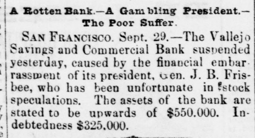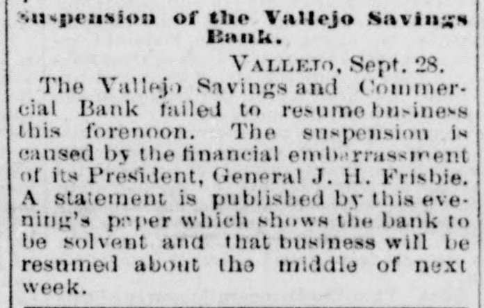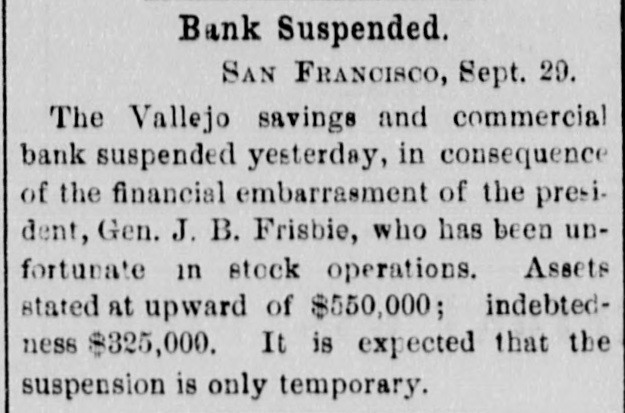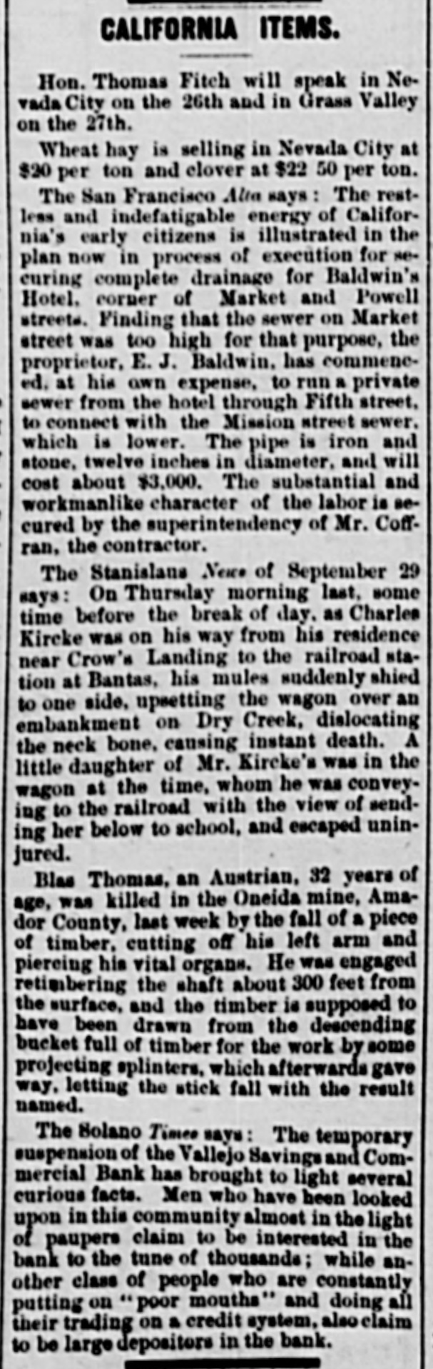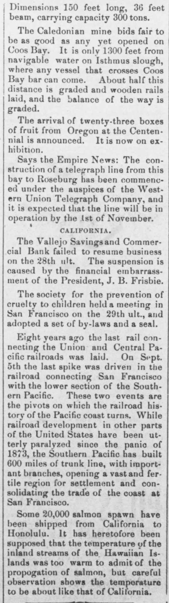 Minor Ventions. By American Press Association to the STAR. BOSTON, Sept. 29.-A prominent house in this city has exported thirty thousand pieces of priut cloth to South America. COLUMBUS, O., Sept. 29.-John Kent, a bar-tender, was knocked down by W m. Hardy and 80 badly injured that he died a few minutes afterwards. LONDON, Sept. 29.-A dispatch from Nish, dated yesterday, says, since 4 o'clock of that morning there has been a continuous and heavy cannonade in the direction of Alexinatz. MILWAUKEE, Sept. 29.-Sparta, in this State, was visited by a serious fire late last night, which destroyed the Tremont House, Lee & Palmer's livery stable, Heller's store and other buildings. Loss estimated at $25,000. LOUISVILLE, Sept. 29.-J. Westman, an employe in L. Krelger's tannery on Seventh street, was caught in the machinery this morning and instantly killed. The deceased came here from Cincinnnati some time ago. NEW YORK, Sept. 29.-A - special to the Graphic from Trenton, N. J., says that a bill in chancery has been filed askiag for the appointment of a Receiver for the Central Railroad of New Jersey. The bill declares the company to be insolvent. SAN FRANCISCO, Sept. 29.-The Vallejo Savings and Commercial Bank suspended yesterday, caused by the financial embarrassment of the President, Gen. J. B. Frisbe, who has been unfortunate in stock speculations. The assets of the bank are stated to be up. wards of $550,000; indebtedness, $325,000. The suspension 18 expected to be temporary. WASHINGTON, Sept. 29.-The Treasury Department has received through the Department of State, from the United State Consul at Copenhagen, information to the effect that the ship Ellen Dyer, of New York, laden with refined petroleum, took fire and was totally destroyed near the Island of Thuno, in the Cattegate. Officers and crew took to the boat and landed on the island, from which they were taken to Aurhus by a Danish revenue cutter and then sent to Copenhagen.