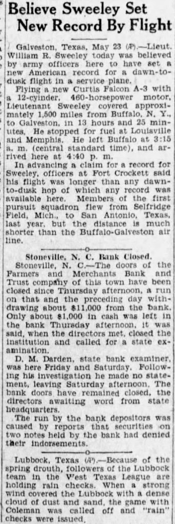Believe Sweeley Set New Record By Flight Galveston, Texas, May 23 William R. Sweeley today was believed by army officers here to have set new record for dawn-todusk flight service plane. Flying new Curtis Falcon A-3 with 12-cyinder. motor, Lieutenant Sweeley covered approximately 1,500 miles from Buffalo, N. to Galveston. 13 hours and 25 minutes, He stopped for fuel at Louisville and Memphis. He left Buffalo at m. (central standard time), and arrived here at 4:40 In advancing claim record for officers at Fort Crockett said his flight was longer than any dawnto-dusk hop of which any record was available here. Members of the first pursuit squadron flew from Selfridge Field, Mich., to San Antonio, Texas. last year. but the distance much shorter than the Buffalo-Galveston air line. Stoneville, N. C. Bank Closed. Stoneville, N. doors of the Farmers and Merchants Bank and Trust company of this town have been closed since Thursday afternoon, run on that and the preceding day withdrawing about from the bank. Only about $1,000 in cash was left in the bank Thursday afternoon. was said, when the met. closed the institution and called for a state examination. M. Darden. state bank examiner, was here Friday and Saturday. Following his investigation he made no statement. leaving Saturday afternoon. The bank doors remained closed. the directors awaiting word from state headquarters. The by the bank depositors was caused by that securities on two notes held by the bank had denied their indorsements. Lubbock. Texas of the spring drouth, followers of the Lubbock team in the West Texas League are holding rain checks. When strong wind the dense cloud of dust and sand, the game with Coleman called off and "rain" checks were issued