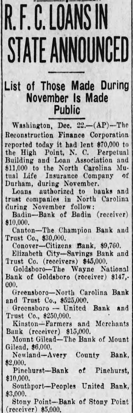 List of Those Made During November Is Made Public Washington, Dec. Reconstruction Finance Corporation reported today had lent $70,000 Point, Perpetual Building Loan the North Carolina tual Life Insurance Company Durham, during November. Loans authorized banks and trust companies North Carolina during November follow: of Badin (receiver) $10,000. Champion Bank and Trust $30,000. Bank, $9,760. Elizabeth Bank and Trust (receivers) Wayne National of Goldsboro (receiver) $147,Carolina Bank Trust Co., $525,000. Greensboro United Bank and $250,000. Merchants Bank of Mount $6,000. County $2,000. of $10,000. United Bank, $3,000. Stony of Stony Point (receiver) $5,000.