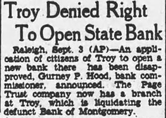 Troy Denied Right Releigh, Sept. application citizens of Troy open bank there has been disapnew Gurney Hood, bank comproved, announced. The Page Trust company now has branch which liquidating the defunct Bank of Montgomery.