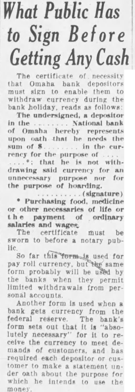 What Public Has to Sign Getting Any Cash The certificate necessity that Omaha bank depositors must sign enable them withdraw currency the bank holiday reads follows The undersigned, depositor National bank Omaha represents upon that the sum in the currency for the purpose that not withdrawing said currency for purpose for the purpose of hoarding. (signature) Purchasing food. medicine other of life or of ordinary salaries and The certificate must be sworn to before notary pub- So far used for roll currency, same form probably will by the when permit limited withdrawals from per sonal accounts. Another form is used when bank gets currency from the federal reserve. The bank's form sets out that "absolutely necessary' for celve the currency to meet demands of customers. and has required each depositor tomer statement der about the for purpose which he intends to use the money
