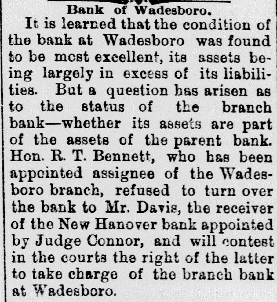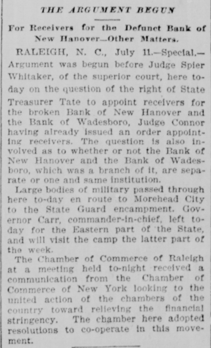 I LADY'S AWFUL SUICIDE. MRS. A. W. FRAPS CUTS HER THROAT FROM EAR TO EAR. Application Made by the State Treasurer for an Additional Receiver for the Defunct Bank of New Hanover. RALEIGH, N. C., June 29.-Special.There was a suicide this morning that caused considerable excitement, following closely, as it did, on the cutting of Whitaker in the fight yesterday. Mrs. A. W. Fraps, the wife of one of our merchants, cut her throat from ear to ear with a razor at 8 o'clock this morning. She had been in delicate health for some time, and her mind had become impaired from the effects of her illness, but her husband and family did not think her malady of a dangerous nature, and were greatly shocked by the tragedy. She arose as usual, and seemed brighter than she ordinarily was, though she had been very despondent for the past few days. She got a razor belonging to her son, got in bed and then cut her throat, after locking the door securely. She was found dead In the bed by her son. State Treasurer Tate has made an application to Judge Conner to have an additional receiver appointed for the defunct Bank of New Hanover, of Wilmington. The State had on hand $15,000 in this bank at the time that it closed its doors, and the additional receiver will look particularly after its interest. The case was argued this afternoon, the State being represented by F. H. Busbee and Mr. George Rountree appeared in opposition to the application. The Bank of Wadesboro, a branch of the Bank of New p Hanover, was also represented by counb sel. Mr. Junius Davis is the receiver at present, and it is not known what order will be made in the cause, The argument is still proceeding to-night, and the order L will not probably be made before tomorrow. a 25 Judge Conner refused to appoint an additional receiver of the Bank of New Hanover, as requested by application of State Treasurer Tate. He makes order, however, appointing a receiver for the Bank of Wadesboro, the branch R bank. The receiver for the latter bank 4t is not yet named.