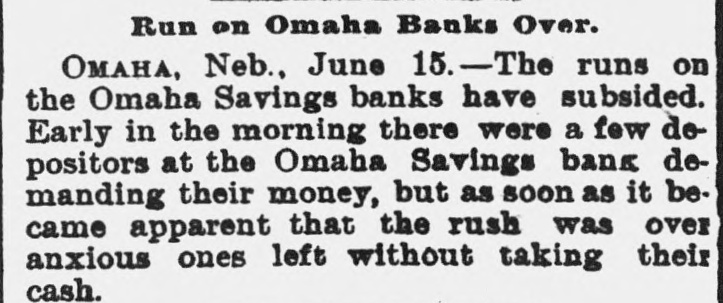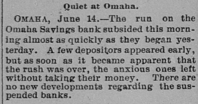 Multiple contemporaneous newspaper reports (June 13–15, 1893) describe an extensive run on the Omaha Savings Bank on June 13 that subsided by June 14. Other Omaha banks (American National, McCague Savings) were closed or suspended, and contagion from those failures appears to have triggered the run on Omaha Savings. The Omaha Savings Bank was besieged by depositors but paid on demand and the run ended quickly; there is no evidence this bank suspended or entered receivership.