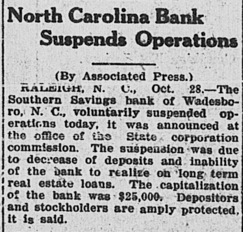 North Carolina Bank Suspends Operations (By Associated Press.) RALEIGH, N. U., Oct. 28.-The Southern Savings bank of Wadesboro, N. C., voluntarily suspended operations today, it was announced at the office of the State corporation commission. The suspension was due to decrease of deposits and inability of the bank to realize on long term real estate loans. The capitalization of the bank was $25,000. Depositors and stockholders are amply protected, it is said.
