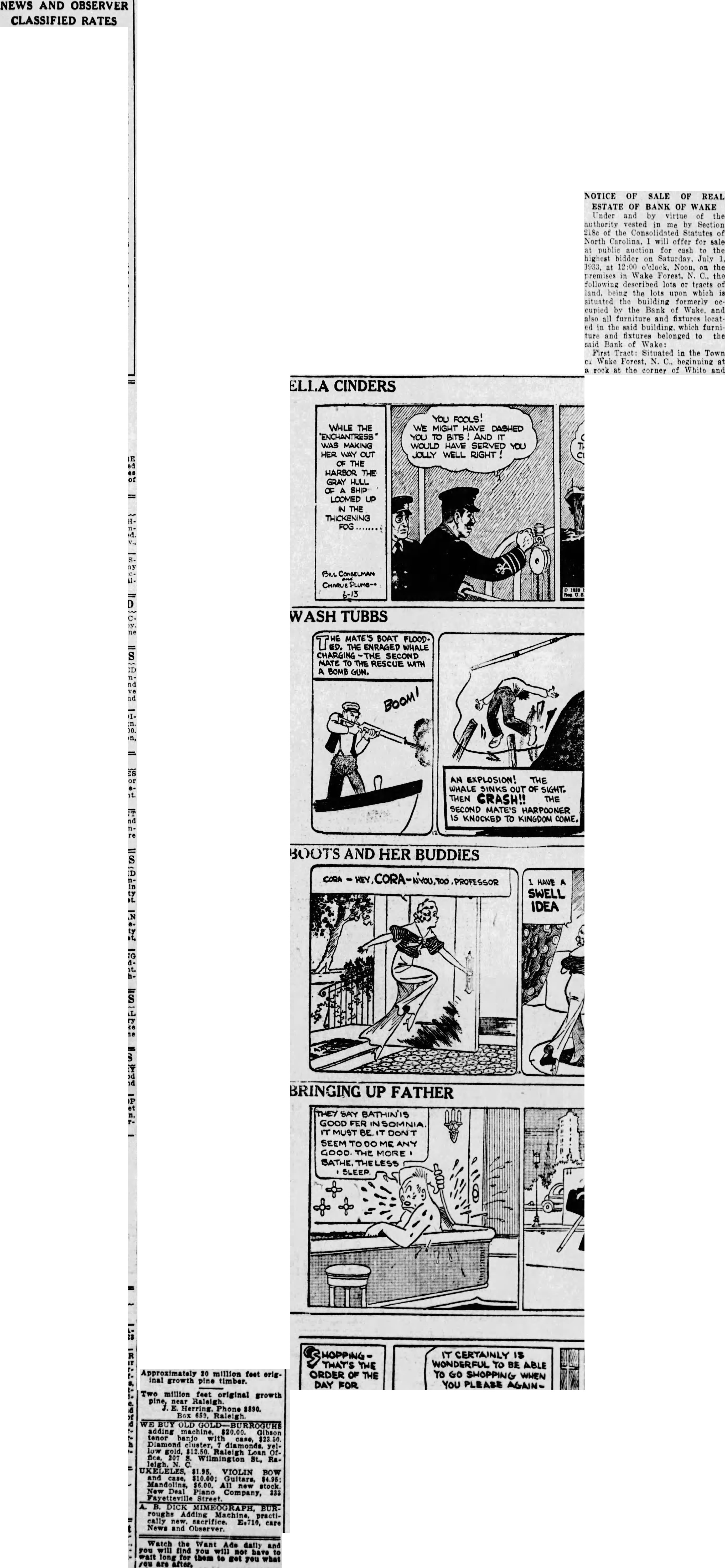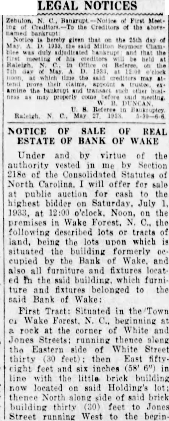 LEGAL NOTICES Bankrupt First Creditors the abovegiven the day adjudicated : Under and by virtue of the authority vested me Section 218e of the Consolidated Statutes of North Carolina. will offer for sale at public auction for cash to the highest bidder on Saturday, July 1933, at 12:00 o'clock. Noon, on the premises in Wake Forest, N. C., the following described lots or tracts land, being the lots upon which is situated the building formerly occupied by the Bank Wake, and also and fixtures located in the said which furniture and fixtures belonged to the said Bank of Wake: First Tract: Situated in the/Town rock at the corner of White and Jones Streets: running thence along the Eastern side of White Street thirty (30 feet): then East fifty. eight feet and six inches (58' in line with the little brick building now located on said Holding's lot; thence North along side said brick building thirty (30) feet to Jones Street running West to the begin-