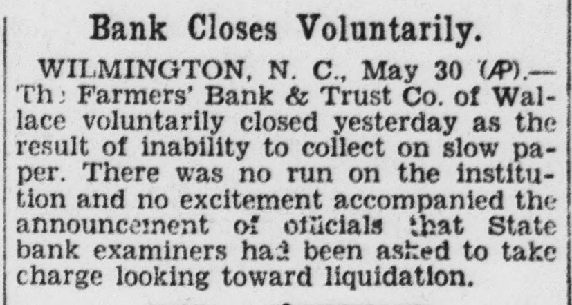 Bank Closes Voluntarily. WILMINGTON, N. C., May 30 (AP).Th: Farmers' Bank & Trust Co. of Wallace voluntarily closed yesterday as the result of inability to collect on slow paper. There was no run on the institution and no excitement accompanied the announcement of officials that State bank examiners had been asked to take charge looking toward liquidation.