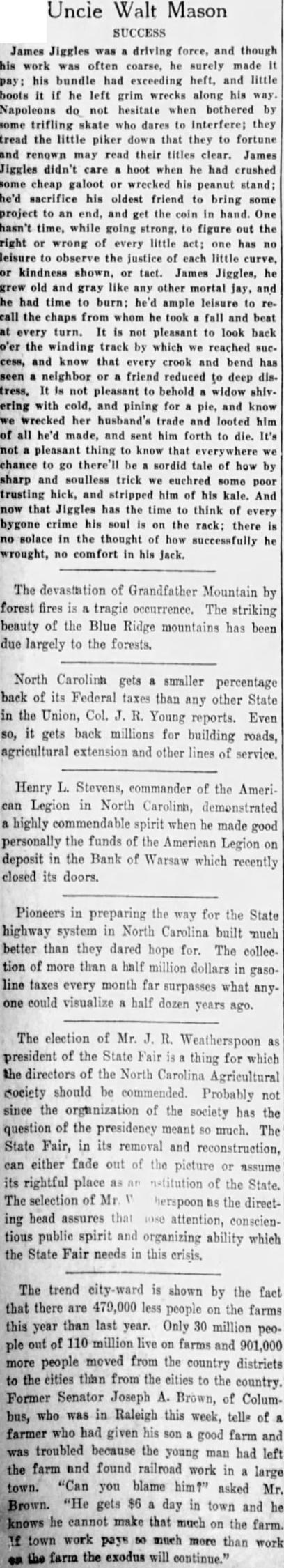 Walt Mason SUCCESS James Jiggles driving force, and though his work often coarse, surely made pay; his bundle had exceeding heft, and little boots he wrecks along his way. Napoleons hesitate bothered some trifling who dares they tread the little piker down that they fortune and renown read their titles clear. James Jiggles didn't hoot when he had crushed cheap galoot wrecked his peanut stand: he'd his oldest friend bring some project end, get the coin hand. One hasn't time, going strong, to figure out the right wrong every little act; one leisure observe the justice each little curve, kindness shown, tact. James Jiggles, old and gray like any other mortal jay, and had time burn: ample leisure the chaps from took fall and beat turn. not pleasant to look back the winding track which and know that every crook and bend neighbor friend reduced deep tress. not pleasant to behold widow shivering with cold, and pining for and know wrecked her husband's trade and him all he'd made, and him forth to die. It's pleasant thing know that chance there'll sordid tale of how sharp and trick some trusting hick, and stripped him his kale. And Jiggles has the time think of every bygone crime the rack; there solace in the thought how successfully wrought, comfort in his jack. The devastation of Grandfather Mountain forest fires tragic occurrence. The striking beauty of the Blue Ridge mountains has been due largely to the forests. North Carolina gets percentage back of its Federal taxes than any other in the Union, Col. Young reports. Even gets back millions for building roads, agricultural extension and other lines of service. Henry L. Stevens, commander of the American Legion in North Carolina, demonstrated highly commendable spirit when he made good personally the funds of the American Legion on deposit in the Bank of Warsaw which recently closed its doors. Pioneers in preparing the way for the State highway system in North Carolina built much better than they dared hope for. The collection of more than half million dollars in line taxes every month far surpasses what anyone could visualize half dozen years ago. The election of Mr. Weatherspoon president of the State for thing which directors of the North Carolina Agricultural Society should be commended. Probably not since the organization of the has society the question of the presidency meant much. The State Fair, in its removal and reconstruction, can either fade out of the picture assume its rightful place the State. selection of the directhead assures that attention, conscientious public spirit and organizing ability which the State Fair needs in this crisis. The trend shown the fact by that there are 479,000 less people the farms this than last year. Only 30 million year peoof live on farms and 901,000 more people moved from the districts country the than from the cities the country. Former Senator Joseph Brown, of Columwho was in Raleigh this bus, week, tells of farmer who had given his good farm and troubled because the had young man left the farm and found railroad work large town. "Can you blame asked Mr. Brown. gets $6 day in town and knows cannot make that much the farm. town work much than work the farm the exodus continue."