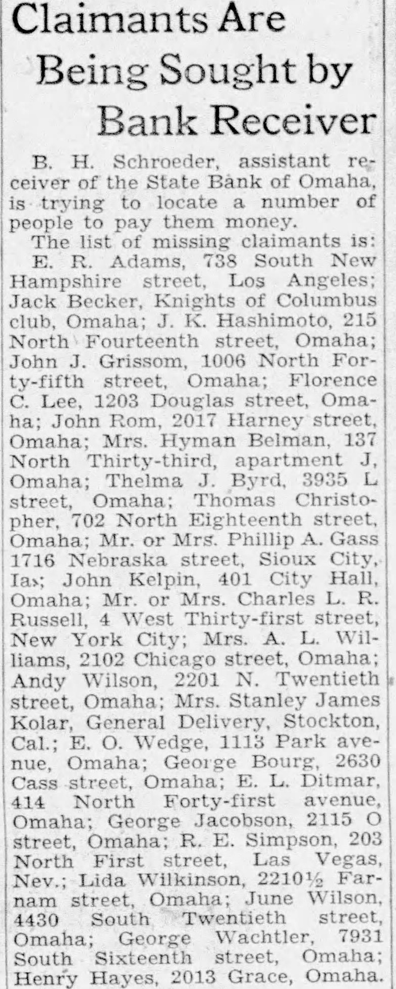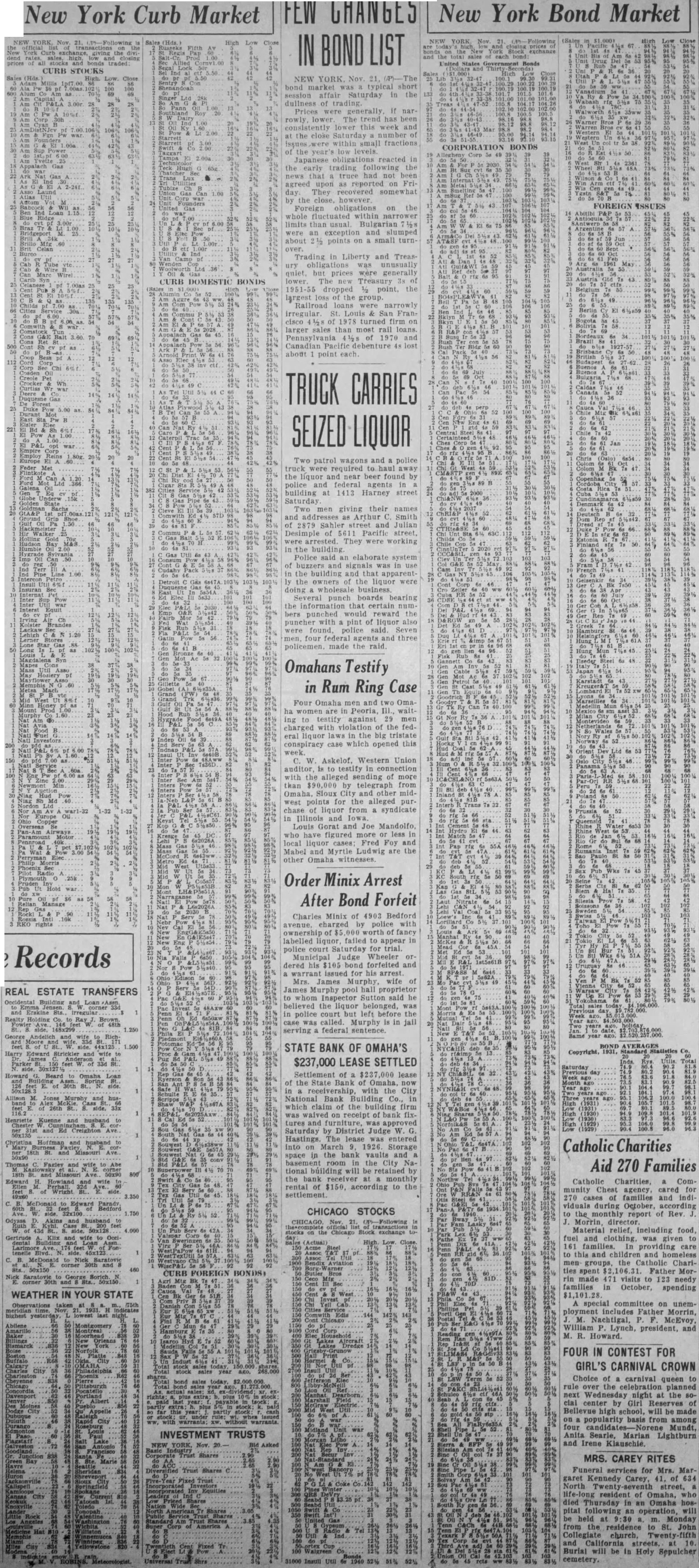IN LIST Bonds CURB STOCKS NEW YORK. Nov. 21, The bond market was typical short session affair Saturday in the dullness of trading Prices were generally If nar rowly lower The trend has been consistently lower this week and the close Saturday number of issues were within small fractions CORPORATION BONDS of the year's low levels. Japanese reacted in the early trading the that truce had not been agreed upon as reported on Friday. They recovered somewhat by the FOREIGN ISSUES Foreign obligations on the whole fluctuated within narrower limits than usual. Bulgarian 1/28 were an exception and slumped about 2Β½ points on a small turnover. Trading in Liberty and Treasury obligations was unusually quiet, but prices were generally CURB DOMESTIC BONDS lower The new Treasury 3s 1951-55 dropped Β½ point, the largest 1088 of the group Railroad loans were narrowly irregular. St. Louis & San Francisco 11/28 of 1978 turned firm on larger sales than most rail loans. Pennsylvania 11/28 of 1970 and Canadian Pacific debenture 4s lost about point each TRUCK CARRIES SEIZED LIQUOR Two patrol wagons and a police truck were required to haul away the liquor and near beer found by police and federal agents in building at 1413 Harney street Saturday Two men giving their names and addresses as Arthur C. Smith of 2879 Sahler street and Julian Desimple of 5611 Pacific street, were arrested. They were working the building. Police said an elaborate system buzzers and signals was in use the building and that apparent the owners of the liquor were doing a wholesale business Several punch boards bearing the information that certain num. bers punched would reward the puncher with pint of liquor also were found, police said. Seven men, four federal agents and three policemen. made the raid. Omahans Testify in Rum Ring Case Four Omaha men and two Omaha women are in Peoria, III., waiting to testify against 29 men charged with violation of the federal liquor laws in the big tristate conspiracy case which opened this week. W. Askelof. Western Union auditor, is to testify in connection with the alleged sending of more than $90,000 by telegraph from Omaha, Sioux City and other midwest points for the alleged purchase of liquor from a syndicate in Illinois and Iowa. Louis Gorat and Joe Mandolfo. who have figured more or less in local liquor cases Fred Foy and Mabel and Myrtle Ludwig are the other Omaha witnesses. Order Minix Arrest After Bond Forfeit Charles Minix of 4903 Bedford avenue, charged by police with ownership of $5 000 worth of fancy labelled liquor, failed to appear in police court Saturday for trial. Municipal Judge Wheeler ordered his $105 bond forfeited and warrant issued for his arrest. Mrs. James Murphy, wife of James Murphy pool hall proprietor to whom Inspector Sutton said he believed the liquor belonged, was police court but left before the case was called. Murphy is in jall serving a federal sentence. STATE BANK OF OMAHA'S Copyright, $237,000 LEASE SETTLED Settlement of a $237,000 lease of the State Bank of Omaha, now a receivership, with the City National Bank Building Co., in which claim of the building firm was waived on receipt of bank fix. tures and furniture, was approv Saturday by District Judge W. G. Hastings. The lease was entered into on March 1926. Storage Catholic Charities space in the bank vaults and basemen room in the City NaAid 270 Families tional bΓΊilding will be retained by the bank receiver at monthly Catholic Charities, a Comrental of $150, according to the munity Chest agency, cared for settlement. 270 cases of families and individuals during October, according CHICAGO STOCKS to the monthly report of Rev. J. J. Morrin, director. Stock Material relief, including food, on the exchange fuel and clothing, was given to 161 families. In providing care to this and children and homeless men- groups, the Catholic Charities spent $2,106.31. Father Morrin made 471 visits to 123 needy families in October, spending A special committee on unemployment includes Father Morrin, M. Nachtigal, P. F. McEvoy, William P. Lynch, president, and M. R. Howard. FOUR IN CONTEST FOR GIRL'S CARNIVAL CROWN Choice of a carnival queen to rule over the celebration planned next Wednesday night at the social center by Girl Reserves of Bellevue high school, will be made on a popularity basis from among four candidates- Norene Mundt, INVESTMENT TRUSTS Anita Searle, Marian Lightburn and Irene Klauschie. MRS. CAREY RITES Trust Funeral services for Mrs. Margaret Kennedy Carey, 41, of 634 North Twenty seventh street, resident of Omaha, who died Thursday in an Omaha hospital following an operation, will be held at 9:30 a. m. Monday from the residence to St. John Collegiate church, Twenty fifth and California streets. at 10. Burial will be in Holy Sepulcher cemetery.