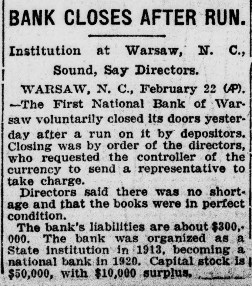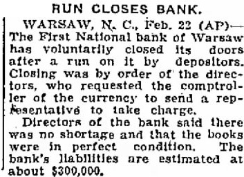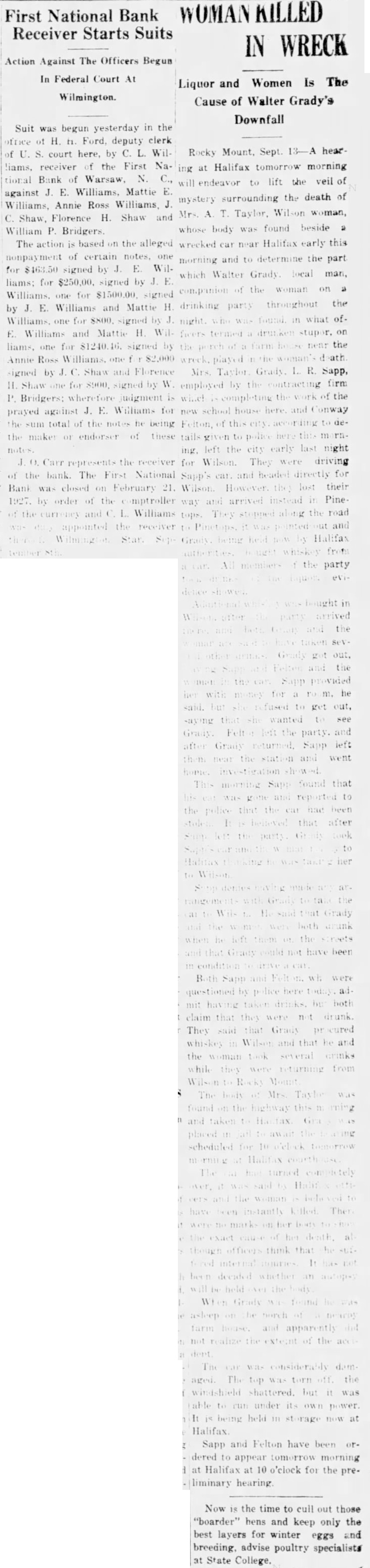 Suit was begun yesterday in the office of H. h. Ford, deputy clerk of U. S. court here, by C. L. Wilof the First Naliams, receiver tional Bank of Warsaw, N. C., against J. E. Williams, Mattie E. Williams, Annie Ross Williams J. C. Shaw, Florence H. Shaw and William P. Bridgers. The action is based on the alleged nonpayment of certain notes. one for $463.50 signed by E. Wilfor signed by Williams. one for $1500.00 signed