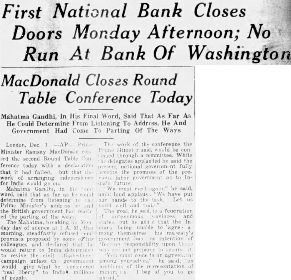 First National Bank Closes Doors Monday Afternoon; No Run At Bank Of Washington MacDonald Closes Round Table Conference Today Mahatma Gandhi, In His Final Word, Said That As Far As He Could Determine From Listening To Address, He And Government Had Come To Parting Of The Ways London, Dec Minister Ramsay MacDonald sed the second Round Table ference today with declaration that it had failed, but that work of arranging independence for India would go Mahatma Gandhi, in word, said that as far as he determine from listening Prime Minister's addr the British government had ed the parting of the ways. The Mahatma, day day of silence morning, steadfastly refused promises proposed by some colleagues and declared that would return to India to the campaign unless th government would give considered 'real liberty" to India millions of people The work of the conference the Prime Minist would be con through committee. While the delegates applauded he said the present national government fully the promises of the prelabor government as to Infuture must he amid loud applaus have put hands Let and The said, federation provinces and but that the Indians being unable to agree his government intention upon prepared come he said, problems the