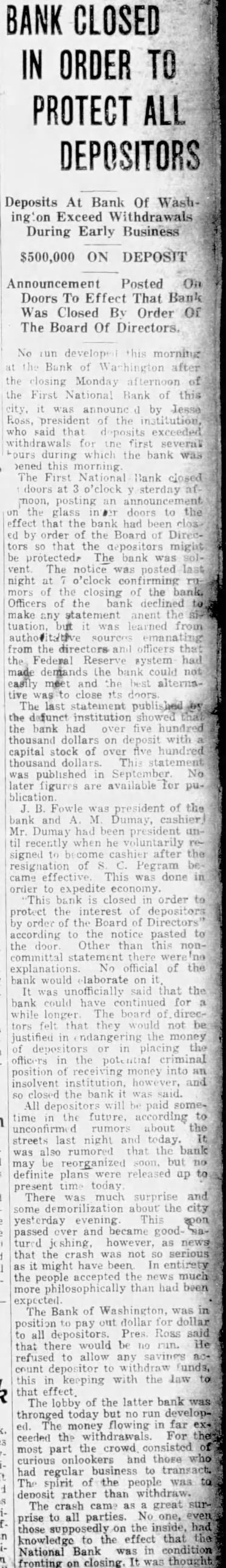 BANK CLOSED IN ORDER TO PROTECT ALL DEPOSITORS Deposits At Bank Of WashExceed Withdrawals During Early Business $500,000 ON DEPOSIT Announcement Posted On Doors To Effect That Bank Was Closed By Order Of The Board Of Directors. No develope this morning Bank of after the closing Monday afternoon of the First National Bank of this was by Ross, president of the institution, said that exceeded withdrawals for the first several during which the bank was bened this morning The First National Bank closed doors sterday moon, posting an the glass doors to the effect that the bank had been order the Board of that the depositors protected The bank vent The notice posted night o'clock of the closing of the bank. Officers of the bank declined make any statement anent tuation, from the Federal Reserve system made demands the bank could and alternative close doors The last statement the defunct institution showed the bank had over five thousand dollars on with capital stock of over five thousand statement published September No later figures are available for blication Fowle was president of the and M Dumay, cashier] Mr. Dumay had president recently when he voluntarily signed cashier after resignation of Pegram came This was done order expedite This bank closed order protect interest order the Board Directors' according the notice pasted the door Other than committal statement explanations. official of the bank would laborate unofficially that bank could have continued for longer The board not justified ndangering placing officers criminal position receiving money into insolvent institution, and so closed the All paid time future, according the streets last night and also rumored that bank was reorganized but no may definite plans were released up present time today There was much surprise and some demorilization about the city yesterday evening This passed over and became shing, however, as news that the crash was not so serious might have In the people accepted the news much more philosophically than had been The Bank of Washington, was in pay out dollar for dollar all depositors. Pres. Ross said that there would be no nin. He refused to allow any count depositor to Funds, this keeping with the law that effect The lobby of the latter bank was thronged today but no run developThe money flowing far ceeded the withdrawals. For most part the crowd consisted curious onlookers and those who had regular business to transact. The spirit of the people was deposit rather than withdraw. The crash came great surto all parties. No one, prise the inside, had those supposedly on knowledge to the effect that National Bank was in condition fronting on closing. It was thought