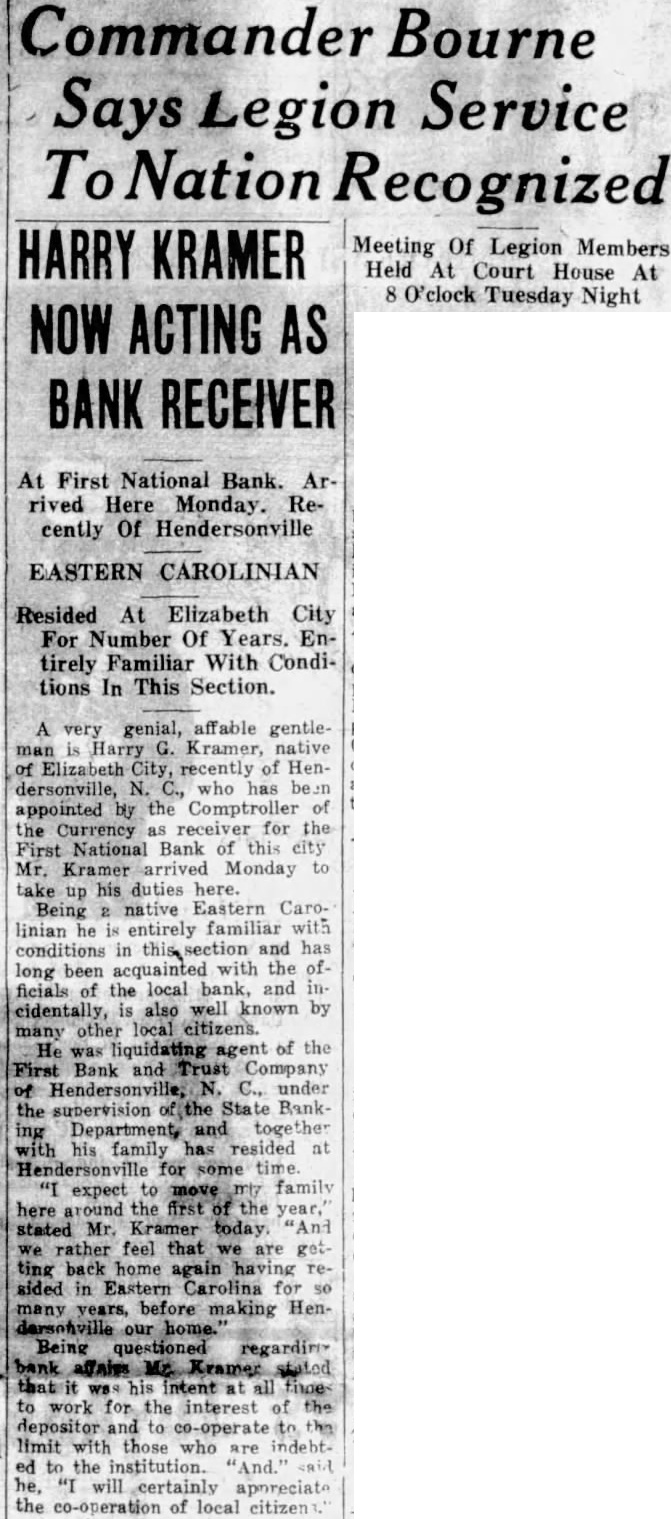 Commander Bourne Legion Service Nation Recognized HARRY KRAMER NOW ACTING AS BANK RECEIVER At First National Bank. Arrived Here Monday. Recently Of Hendersonville EASTERN CAROLINIAN Resided At Elizabeth City For Number Of Years. Entirely Familiar With Conditions In This Section. A very genial, affable gentleman Harry Kramer, native Elizabeth City, recently of Hendersonville, who appointed the Comptroller of the Currency receiver for the First National Bank of this city Mr. Kramer Monday take his duties here. Being Eastern Carolinian he entirely familiar with conditions in and has long been acquainted with the ficials of the local bank, and cidentally, is also well known by many other local citizens. He liquidating agent of the First Bank and Trust Company under the supervision State BankDepartment, and with his family has resided Hendersonville for some time. move family expect here around the the stated Mr. Kramer today. rather feel that we are ting back home again having sided in Eastern Carolina for many years, before HenBeing questioned bank Kramer his all work for the interest the depositor limit with those who indebtto the institution. will certainly appreciate the co-operation of local citizen Meeting Of Legion Members Held At Court House At O'clock Tuesday Night