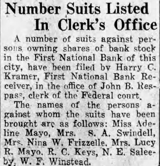Number Suits Listed In Clerk's Office number of suits against perowning shares of bank the First National Bank of this city, have been filed by Harry Kramer, First National Bank Receiver, the office of John clerk the Federal court. The names of the persons gainst whom the suits have been brought are as follows: Miss Adeline Mayo, Mrs. Swindell, Mrs. Nina W. Mrs. Lucy Mayo. Keys, N. SaleeWinstead.