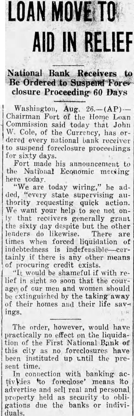 IN RELIEF National Bank Receivers to Ordered to closure Proceeding Days Washington, Aug. Chairman Fort of the Home Loan Commission said today that John Cole, of the Currency, has dered every national receiver suspend foreclosure proceedings Fort made his announcement the National Economic here today are today wiring," he state supervising thority requesting quick action. We want help to not your see that receivers generally grant sixty day despite but the other lenders likewise. There are times when forced liquidation indebtedness tainly if there any other means of credit exists. would with sight soon that the courour and should extinguished by the their homes and their life ings. The order, however, would have practically effect the liquidation of the First National Bank of this city foreclosures have instituted up until the sent time. connection with banking to foreglose means ito advertise and sell real personal property held as security obligations due the banks or individuals.
