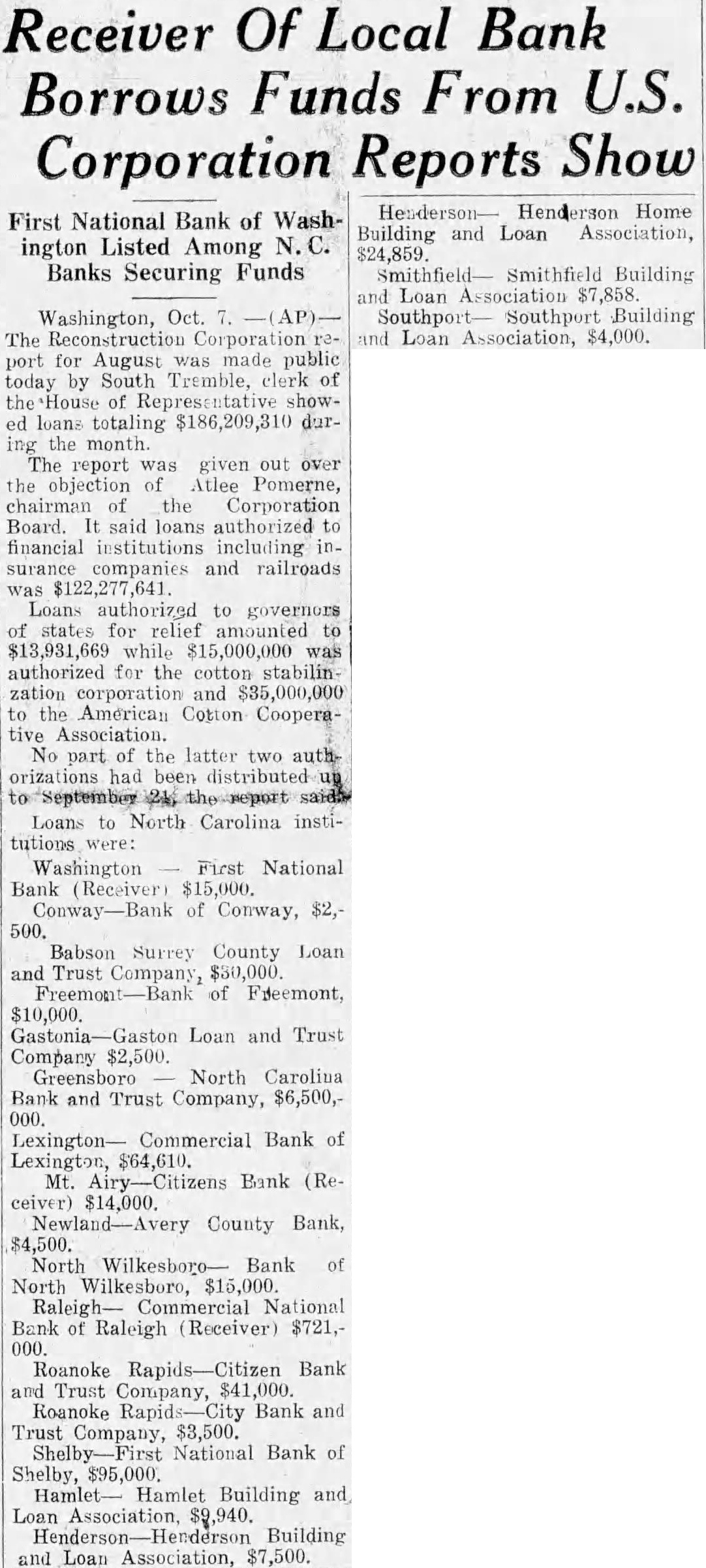 Receiver Of Local Bank Borrows Funds From U.S. Show Corporation Reports First National Bank of Washington Listed Among Banks Securing Funds Washington, Oct. Reconstruction port for August was made public today by South Tremble, clerk of of showed loans totaling month The report given out over the objection of Atlee Pomerne, of the Corporation Board. said loans authorized to financial institutions including companies and railroads Loans authorized to governors states relief amounted while $15,000,000 was authorized for the cotton stabilinzation corporation and the American Cotton tive Association. No part of the latter two had been Loans North Carolina institutions Washington First National Bank (Receiver) of Conway, Babson Surrey County Loan and Trust Company, of Freemont, $10,000. Loan and Trust Company $2,500. Greensboro North Carolina Bank and Trust Company, $6,500,000. Bank of Mt. Bank ceiver) $14,000. County Bank, $4,500. North Bank North Wilkesboro, $15,000. Raleigh- Commercial National Bank Raleigh (Receiver) $721,- Roanoke Bank and Trust Company, Roanoke Bank and Trust Company, $3,500. National Bank Shelby, $95,000. Hamlet Building and Loan Association, Building and Loan Association, Henderson Home Building and Loan Association, Smithfield Building and Loan Association Southport Building Loan $4,000.