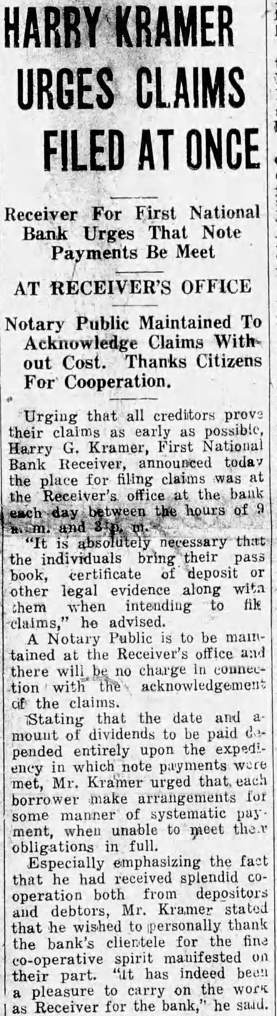 HARRY KRAMER URGES CLAIMS FILED AT ONCE Receiver For First National Bank Urges That Note Be Meet AT RECEIVER'S OFFICE Notary Public Maintained To Acknowledge Claims Without Cost. Thanks Citizens For Cooperation. Urging that all creditors prove their claims as early as possible, G. Kramer, First National Harry Bank Receiver, announced today the place for filing claims was Receiver's bank the hours of that the individuals bring their pass book, certificate deposit or other legal evidence along with them when intending to file claims," he advised. A Public to be mainNotary tained at the Receiver's office and there no charge in connection with of the claims. Stating that the date and mount dividends to be paid pended entirely upon the expediency which note met, Mr. Kramer urged that each borrower make arrangements for some manner of systematic pay ment, when unable to meet in full. Especially emphasizing the fact that he had received splendid operation both from depositors Mr. Kramer stated debtors, that he wished to personally thank the bank's clientele for the fine co-operative spirit manifested their part. "it has indeed been to on the pleasure carry Receiver for the bank," he said.