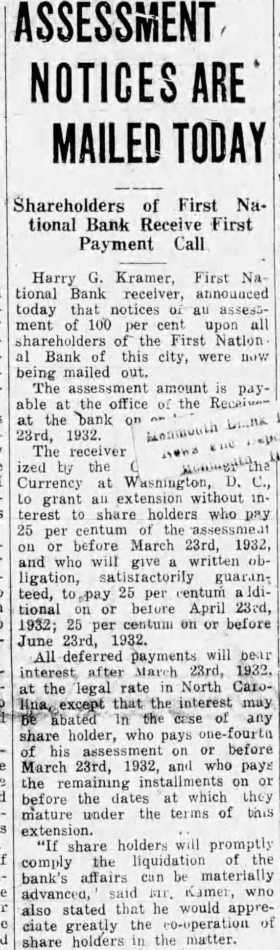 NOTICES Shareholders of First National Bank Receive First Payment Call Harry G. Kramer, First tional Bank receiver, announced today that notices assessment of 100 per cent upon all shareholders the First Nation Bank this city, were being mailed out. The assessment amount is able the office the at the bank on 23rd, 1932. The receiver ized by the Currency at Washington, D. grant extension without terest share holders who pay 25 per centum the before March 23rd, 1932, on and who will written ligation, satisfactorily guaranteed, 25 entum per tional or before April 23rd, 1932; 25 centum on or before June 23rd, 1932. All deferred payments will interest after March 23rd, 1932. the legal rate North Carothat the interest may the case any share holder, who pays assessment before on March 23rd, 1932, and who pays the remaining installments on or before the dates which they mature under the of extension. share holders will promptly the liquidation of the comply bank's affairs can materially advanced, said Kamer, who also stated that he would appreciate greatly the co-operation share holders the matter.