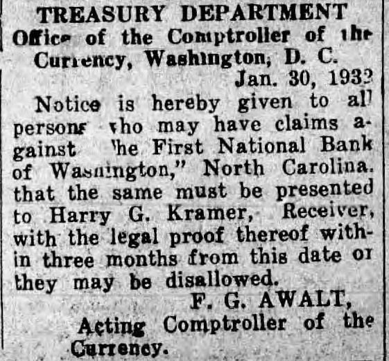 TREASURY DEPARTMENT Office of the Comptroller of the Currency, Washington, D. C. Jan. 30, 1933 Notice is hereby given to all persons who may have claims a gainst 'he First National Bank of Wasnington," North Carolina that the same must be presented to Harry G. Kramer, Receiver, with the legal proof thereof within three months from this date or they may be disallowed. F. G. AWALT, Acting Comptroller of the Currency.