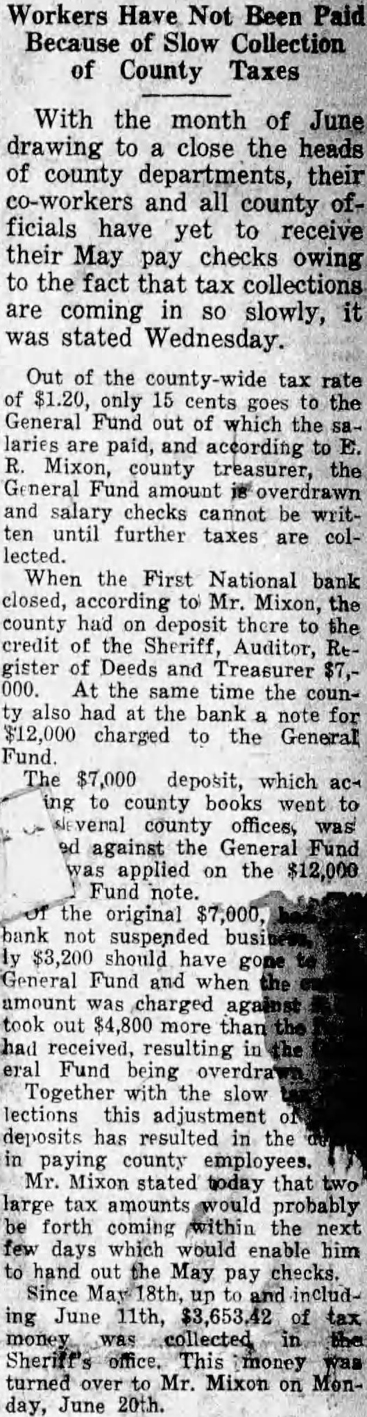 Workers Have Not Been Paid Because of Slow Collection of County Taxes With the month of June drawing to close the heads of county departments, their co-workers and all county officials have yet to receive their May pay checks owing to the fact that tax collections are coming in SO slowly, was stated Wednesday. Out of the tax rate only 15 cents goes the General Fund out of which the laries are paid, and according to Mixon, county treasurer, the General Fund amount overdrawn and salary checks cannot be ten until further taxes are collected. When the First National bank closed, according to Mr. Mixon, the county had deposit there the credit of the Sheriff, Auditor, gister of Deeds and Treasurer 000. At the time the same counalso had at the bank for note $12,000 charged to the General Fund The deposit, which ing county books went to county offices, against the General Fund applied the Fund note. original bank suspended should have General Fund and when amount charged took out $4,800 more resulting Fund being Together with the slow lections this adjustment deposits has resulted in the paying county Mr. Mixon stated today that large tax probably forth coming within the days which would enable him hand out the May checks. Since ing June 11th, $3,653.42 money collected This money turned Mr. Mixon day, June 20th.