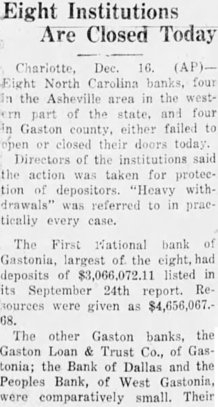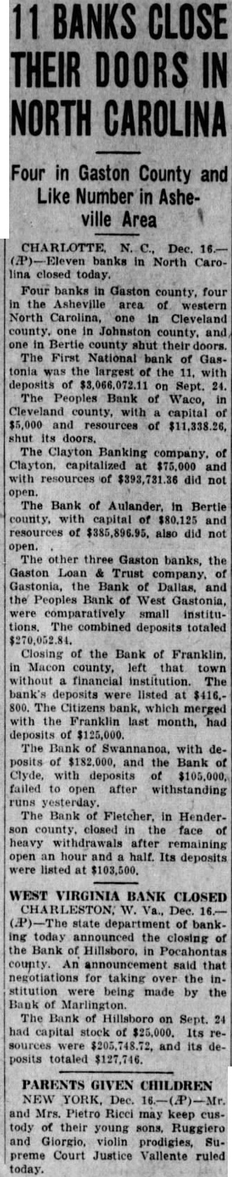 WEST FAILURES North Carolina Hardest Hit, With Eleven Institutions Closing Doors Charlotte, banks in North Carolina closed their doors today. Four banks in Gaston county, four the Asheville area of western North Carolina, one in Cleveland Johnston county and one in Bertie county shut their doors. The First National Bank Gastonia the largest of the eleven with posits of $3,066,072.11 September 24. Waco Bank Shuts Doors The Peoples Bank Waco, Cleveland county, with capital and resources of shut its doors. The Clayton Banking Company, Clayton, capitalized $75,000 and with resources did The Bank of Aulander, in Bertie county, with capital of and sources of also did open. The other three Gaston banks, the Gaston Loan and Trust Company, the Bank of Dallas the Peoples Bank of West Gastonia, small The deposits totaled $270,052.84 Closing of the bank of Franklin, Macon county, left that town without financial institution. The bank's its were listed $416,800. The CitiBank, which merged with the Franklin last month, had deposits $125,000. The bank of Swannanoa, with posits of $182,000 and the bank with deposits failed open runs yesterThe bank of Fletcher, in Henderson county, closed the face of heavy after open hour and half. Its deposits listed South Carolina Bank Closed York, Dec. Bank Clover, York county, closed Lee Robinson, president of the First National Bank Gastonia, which failed open this morning, also president of the Clover instituThe bank had resources of about $650,000. Closure In Salt Lake City Salt Lake City, Dec. The Columbia Trust Company of this city placed the hands of the State Banking Department today. Frank B. Cook, president of the institution. said the board of quested the closing order to protect bank not insolvent, twenty the business Monday, and the opinion the board that every depositor will paid Cook said. posits assets West Virginia Bank Closed The State Department of announced closing of the Bank Hillsboro, Pocahontas county. The said the bank Friday and that for taking institution were being made Bank of Marlinton. The Bank of Hillsboro 24 had capital stock resources and deposits totaled $127,746.