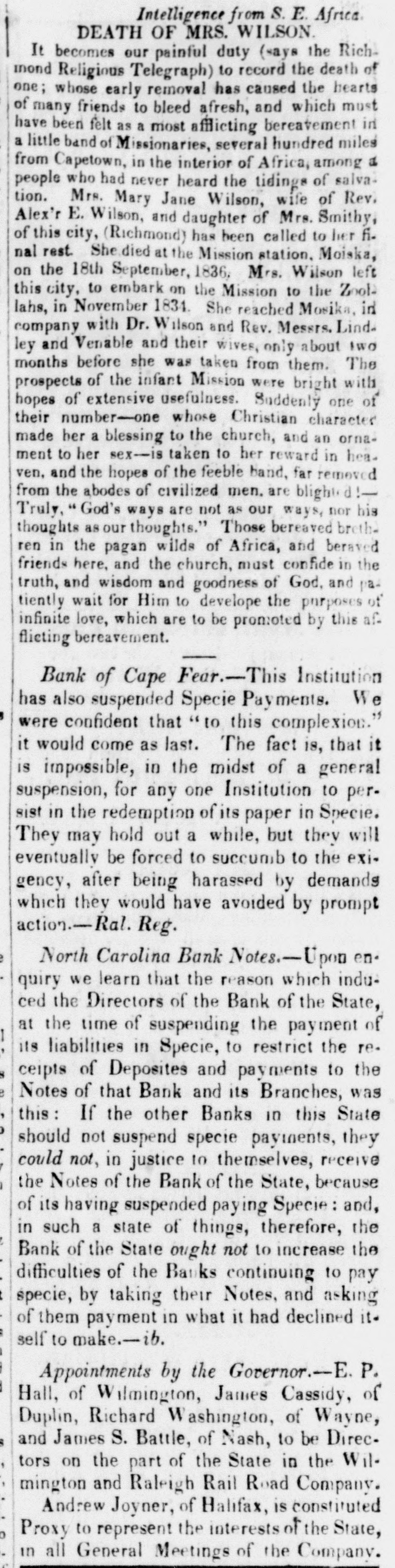 Intelligence from S. E. Africa. DEATH OF MRS. WILSON It becomes our painful duty (says the Richmond Religious Telegraph) to record the death of one; whose early removal has caused the hearts of many friends to bleed afresh, and which must have been felt as a most afflicting bereavement in a little band of Missionaries, several hundred miles in a never heard the of Jane wife of Rev. people from tion. Capetown, who Mrs. had Mary the interior Wilson, of tidings Africa, among salvaAlex'r E. Wilson, and daughter of Mrs. Smithy, of this city, (Richmond) has been called to her fi. nal rest. She died at the Mission station. Moiska, on the 18th September, 1836, Mrs. Wilson left this city, to embark on the Mission to the Zoollahs, in November 1834. She reached Mosika, in company with Dr. Wilson and Rev. Messrs. Lind. ley and Venable and their wives, only about two months before she was taken from them. The were with prospects of the infant Mission bright hopes of extensive usefulness. Suddenly one of their number-one whose Christian character made her a blessing to the church, and an ornament to her sex-is taken to her reward in hea. ven, and the hopes of the feeble band, far removed from the abodes of civilized men. are blight d:Truly, God's ways are not as our ways, nor his thoughts as our thoughts." Those bereaved breth. ren in the pagan wilds of Africa, and beraved friends here, and the church, must confide in the truth, and wisdom and goodness of God. and patiently wait for Him to develope the purposes of infinite love, which are to be promoted by this af. flieting bereavement. Bank of Cape Fear.-This Institution has also suspended Specie Payments. We 5 were confident that "to this complexion." it would come as last. The fact is, that it is impossible, in the midst of a general suspension, for any one Institution to persist in the redemption of its paper in Specie. They may hold out a while, but they will eventually be forced to succumb to the exigency, after being harassed by demands which they would have avoided by prompt action.-Ral. Reg. e North Carolina Bank Notes.-Upon enquiry we learn that the reason which induced the Directors of the Bank of the State, at the time of suspending the payment of 1 ; its liabilities in Specie, to restrict the re. 8 ceipts of Deposites and payments to the e Notes of that Bank and its Branches, was , this : If the other Banks in this State b should not suspend specie payments, they could not, in justice to themselves, receive the Notes of the Bank of the State, because of its having suspended paying Specie: and, in such a state of things, therefore, the e Bank of the State ought not to increase the ( difficulties of the Banks continuing to pay t specie, by taking their Notes, and asking of them payment in what it had declined it. : self to make.-ib. i j Appointments by the Governor.-E. P. I Hall, of Wilmington, James Cassidy, of Duplin, Richard Washington, of Wayne, s and James S. Battle, of Nash, to be Direc. , tors on the part of the State in the Wil, mington and Raleigh Rail Road Company. . Andrew Joyner, of Halifax, is constituted Proxy to represent the interests of the State, o in all General Meetings of the Company.