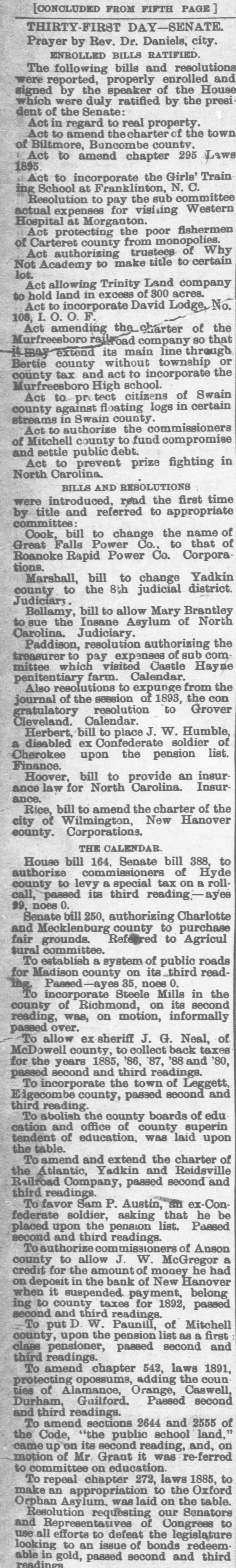 THIRTY-FIRST DAY-SENATE. Prayer by Rev. Dr. Daniels, city. ENROLLED BILLS RATIFIED. The following bills and resolutions were reported, properly enrolled and signed by the speaker of the House which were duly ratified by the presi dent of the Senate: Act in regard to real property. Act to amend thecharter of the town of Biltmore, Buncombe county. Act to amend chapter 295 Laws 1895 Act to incorporate the Girls' Train ing School at Franklinton, N. C. Resolution to pay the sub committee actual expenses for visiting Western Hospital at Morganton. Act protecting the poor fishermen of Carteret county from monopolies. Act authorizing trustees of Why Not Academy to make title to certain lot. Act allowing Trinity Land company to hold land in excess of 300 acres. Act to incorporate David Lodge, No. 108, I. O. 0. F. Act amending the charter of the Murfreesboro railroad company so that it may extend its main line through Bertie county without township or county tax and act to incorporate the Murfreesboro High school. Act to pro tect citizens of Swain county against floating logs in certain streams in Swain county. Act to authorize the commissioners of Mitchell county to fund compromise and settle public debt. Act to prevent prize fighting in North Carolina. BILLS AND RESOLUTIONS were introduced, read the first time by title and referred to appropriate committes: Cook, bill to change the name of Great Falls Power Co., to that of Roanoke Rapid Power Co. Corpora tions. Marshall, bill to change Yadkin county to the 8th judicial district. Judiciary. Bellamy, bill to allow Mary Brantley to sue the Insane Asylum of North Carolina. Judiciary. Paddison, resolution authorizing the treasurer to pay expenses of sub committee which visited Castle Hayne penitentiary farm. Calendar. Also resolutions to expunge from the journal of the session of 1893, the con gratulatory resolution to Grover Cleveland. Calendar. Herbert, bill to place J. W. Humble, a disabled ex Confederate soldier of Cherokee upon the pension list. Finance. Hoover, bill to provide an insurance law for North Carolina. Insurance. Rice, bill to amend the charter of the city of Wilmington, New Hanover county. Corporations. THE CALENDAR. House bill 164, Senate bill 388, to authorize commissioners of Hyde county to levy a special tax on a rollcall, passed its third reading-ayes 99, noes 0. Senate bill 250, authorizing Charlotte and Mecklenburg county to purchase fair grounds. Referred to Agricul tural committee. To establish a system of public roads for Madison county on its third reading. Passed-ayes 35, noes 0. To incorporate Steele Mills in the county of Richmond, on its second reading, was, on motion, informally passed over. To allow ex sheriff J. G. Neal, of McDowell county, to collect back taxes for the years 1885, '86, '87, '88 and '80, passed second and third readings. To incorporate the town of Leggett, Edgecombe county, passed second and third reading. To abolish the county boards of edu cation and office of county superin tendent of education, was laid upon the table. To amend and extend the charter of the Atlantic, Yadkin and Reidsville Railroad Company, passed second and third readings. To favor Sam P. Austin, an ex-Confederate soldier, asking that he be placed upon the pension list. Passed second and third readings. To authorize commissioners of Anson county to allow J. W. McGregor a credit for the amount of money he had on deposit in the bank of New Hanover when it suspended payment, belong ing to county taxes for 1892, passed second and third readings. To put D. W. Paunill, of Mitchell county, upon the pension list as a first class pensioner, passed second and third readings. To amend chapter 542, laws 1891, protecting opossums, adding the coun ties of Alamance, Orange, Caswell, Durham, Guilford. Passed second and third readings. To amend sections 2644 and 2555 of the Code, "the public school land," came up on its second reading, and, on motion of Mr. Grant it was re-ferred to committee on education. To repeal chapter 272, laws 1885, to make an appropriation to the Oxford Orphan Asylum, was laid on the table. Resolution requesting our Senators and Represe: