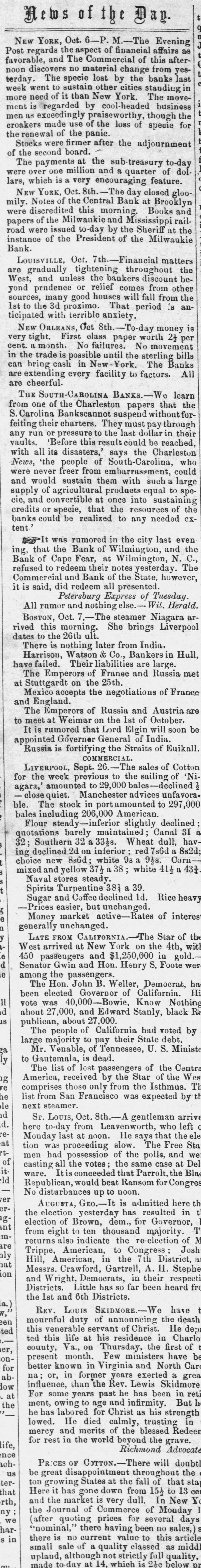 # News of the Day. NEW YORK, Oct. 6-P. M.-The Evening Post regards the aspect of financial affairs as favorable, and The Commercial of this afternoon discovers no material change from yesterday. The specie lost by the banks last week went to sustain other cities standing in more need of it than New York. The movement is regarded by cool-headed business men as exceedingly praiseworthy, though the croakers made use of the loss of specie for the renewal of the panic. Stocks were firmer after the adjournment of the second board. The payments at the sub-treasury to-day were over one million and a quarter of dollars, which is a very encouraging feature. NEW YORK, Oct. 8th. The day closed gloomily. Notes of the Central Bank at Brooklyn were discredited this morning. Books and papers of the Milwaukie and Mississippi railroad were issued to-day by the Sheriff at the instance of the President of the Milwaukie Bank. LOUISVILLE, Oct. 7th. Financial matters are gradually tightening throughout the West, and unless the bankers discount beyond prudence or relief comes from other sources, many good houses will fall from the 1st to the 3d proximo. That period is anticipated with terrible anxiety. NEW ORLEANS, Oct 8th.-To-day money is very tight. First class paper worth 2½ per cent. a month. No failures. No movement in the trade is possible until the sterling bills can bring cash in New York. The Banks are extending every facility to factors. All are cheerful. THE SOUTH-CAROLINA BANKS. We learn from one of the Charleston papers that the S. Carolina Bankscannot suspend without forfeiting their charters. They must pay through any run or pressure to the last dollar in their vaults. 'Before this result could be reached, with all its disasters,' says the Charleston News, 'the people of South-Carolina, who were never freer from embarrassment, could and would sustain them with such a large supply of agricultural products equal to specie, and convertible at once into sustaining credits or specie, that the resources of the banks could be realized to any needed extent' It was rumored in the city last evening, that the Bank of Wilmington, and the Bank of Cape Fear, at Wilmington, N. C., refused to redeem their notes yesterday. The Commercial and Bank of the State, however, it is said, did redeem all presented. Petersburg Express of Tuesday. All rumor and nothing else. Wil. Herald. BOSTON, Oct. 7. The steamer Niagara arrived this morning. She brings Liverpool dates to the 26th ult. There is nothing later from India. Harrison, Watson & Co., Bankers in Hull, have failed. Their liabilities are large. The Emperors of France and Russia met at Stuttgardt on the 25th. Mexico accepts the negotiations of France and England. The Emperors of Russia and Austria are to meet at Weimar on the 1st of October. It is rumored that Lord Elgin will soon be appointed Governor General of India. Russia is fortifying the Straits of Euikall. COMMERCIAL. LIVERPOOL, Sept. 26. The sales of Cotton for the week previous to the sailing of 'Niagara,' amounted to 29,000 bales-declined ½ - close quiet. Manchester advices unfavorable. The stock in port amounted to 297,000 bales including 206,000 American. Flour steady-inferior slightly declined; quotations barely maintained; Canal 31 a 32; Southern 32 a 33½s. Wheat dull, having declined 2d on inferior; red 7s6d a 8s2d; choice new 8s6d; white 9s a 9½s. Corn-mixed and yellow 37½ a 38; white 41½ a 43½. Naval stores steady. Spirits Turpentine 38¼ a 39. Sugar and Coffee declined 1d. Rice heavy -Prices easier, but unchanged. Money market active Rates of interest generally unchanged. LATE FROM CALIFORNIA. The Star of the West arrived at New York on the 4th, with 450 passengers and $1,250,000 in gold.-Senator Gwin and Hon. Henry S. Foote were among the passengers. The Hon. John B. Weller, Democrat, has been elected Governor of California. His vote was 40,000--Bowie, Know Nothing about 27,000, and Edward Stanly, black Republican, about 27,000. The people of California had voted by large majority to pay their State debt. Mr. Venable, of Tennessee, U. S. Minister to Gautemala, is dead. The list of lost passengers of the Central America, received by the Star of the West, comprises those only from the Isthmus. The list from San Francisco was expected by the next steamer. ST. LOUIS, Oct. 8th.-A gentleman arrived here to-day from Leavenworth, who left on Monday last at noon. He says that the election was proceeding slow. The Free State men had possession of the polls, and were casting all the votes; the same case at Delaware. It is conceeded that Parrolt, the Black Republican, would beat Ransom for Congress. No disturbances up to noon. AUGUSTA, GEO. It is admitted here that the election yesterday has resulted in the election of Brown, dem., for Governor, from eight to ten thousand majority. The returns also indicate the re-election of Mr. Trippe, American, to Congress; Joshua Hill, American, in the 7th District, and Messrs. Crawford, Gartrell, A. H. Stephens and Wright, Democrats, in their respective Districts. Little has so far been heard from the 1st and 6th Districts. REV. LOUIS SKIDMORE. We have the mournful duty of announcing the death of this venerable servant of Christ. He departed this life at his residence in Charlotte county, Va., on Thursday, the first of present month. Few ministers have been better known in Virginia and North Carolina; or, in former years exerted a great influence, than the Rev. Lewis Skidmore. For some years past he has been in retirement, owing to age and infirmity. But he he has labored for Christ as his strength allowed. He died calmly, trusting in mercy and merits of the blessed Redeemer for rest in the world beyond the grave. Richmond Advocate PRICES OF COTTON. There will doubtless be great disappointment throughout the cotton growing States at the fall of that staple. Here it has gone down from 15½ to 13 cents and the market is very dull. In New York the Journal of Commerc